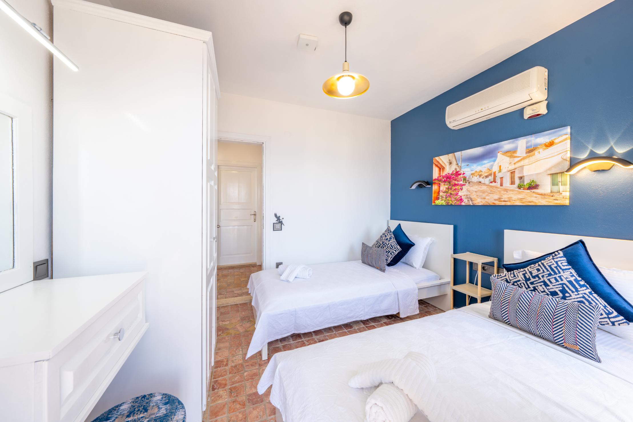 A feature limestone archway leads to a spacious king size bedroom and a twin room – each of these have their own balconies.