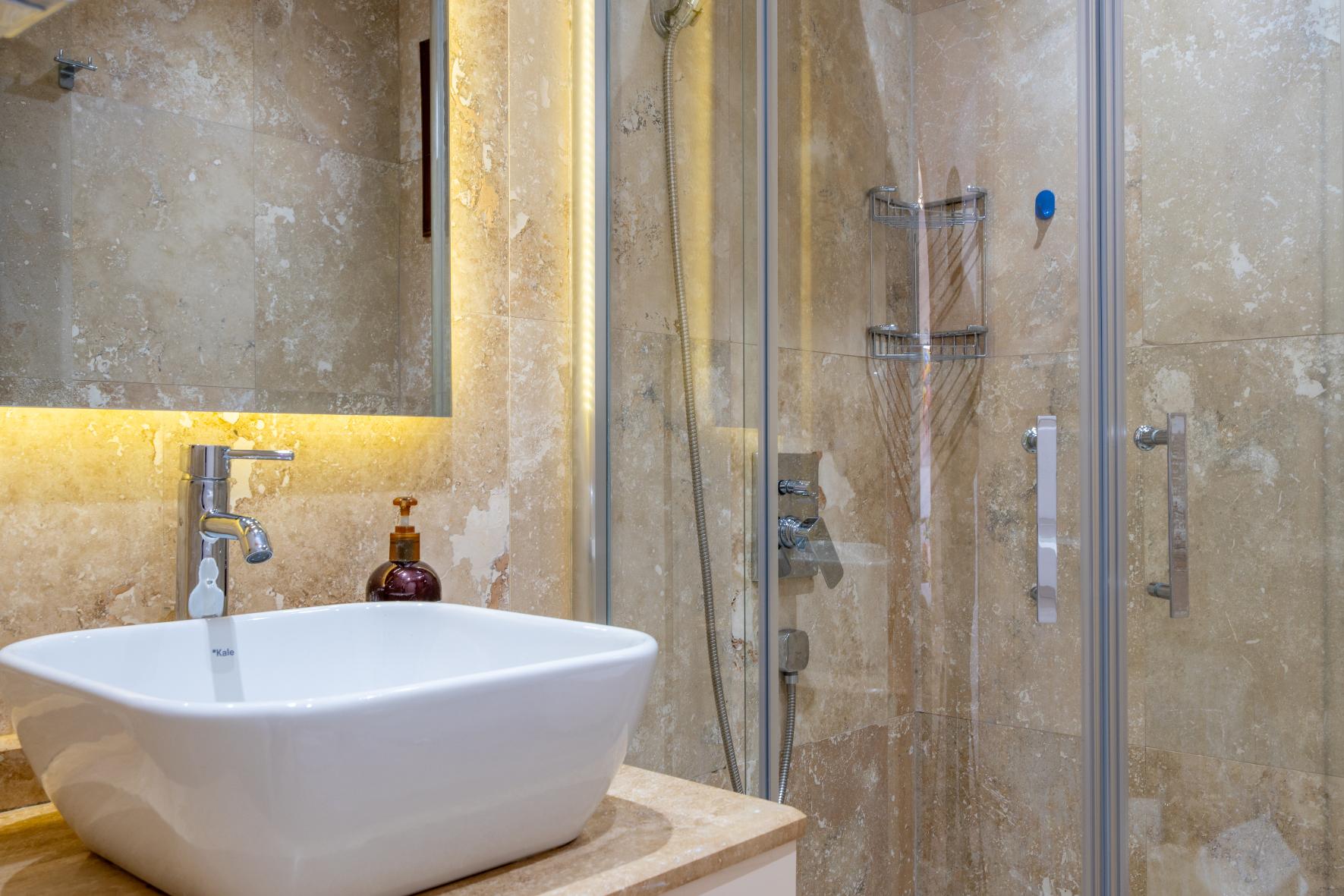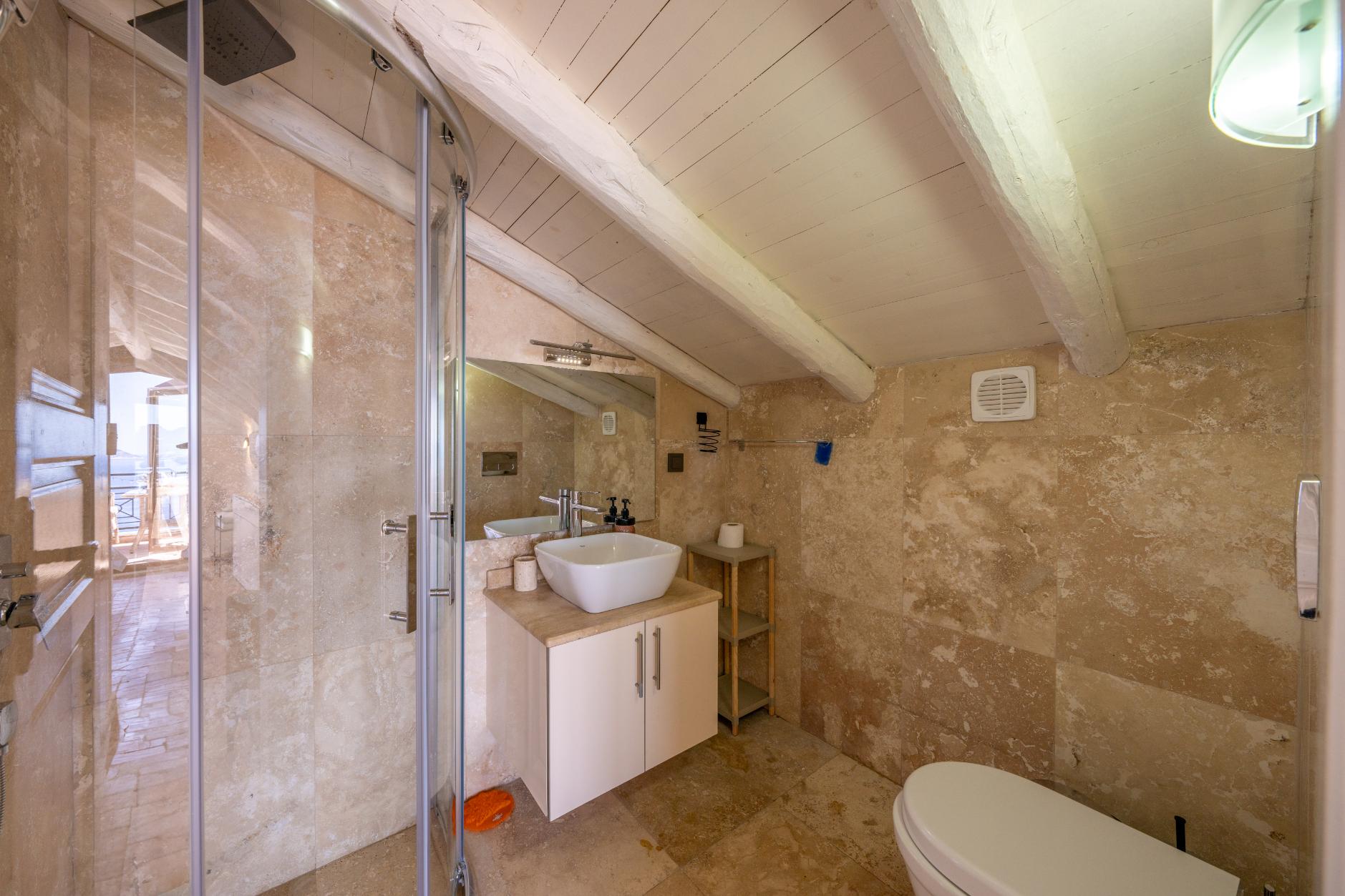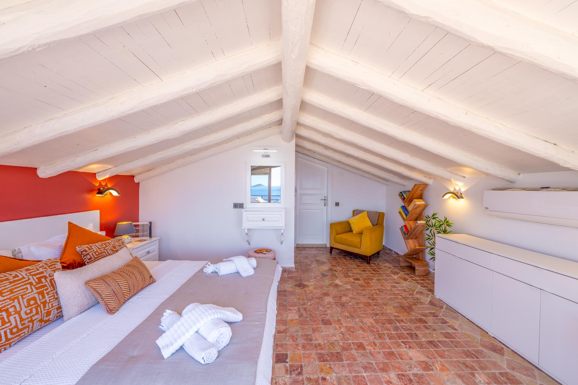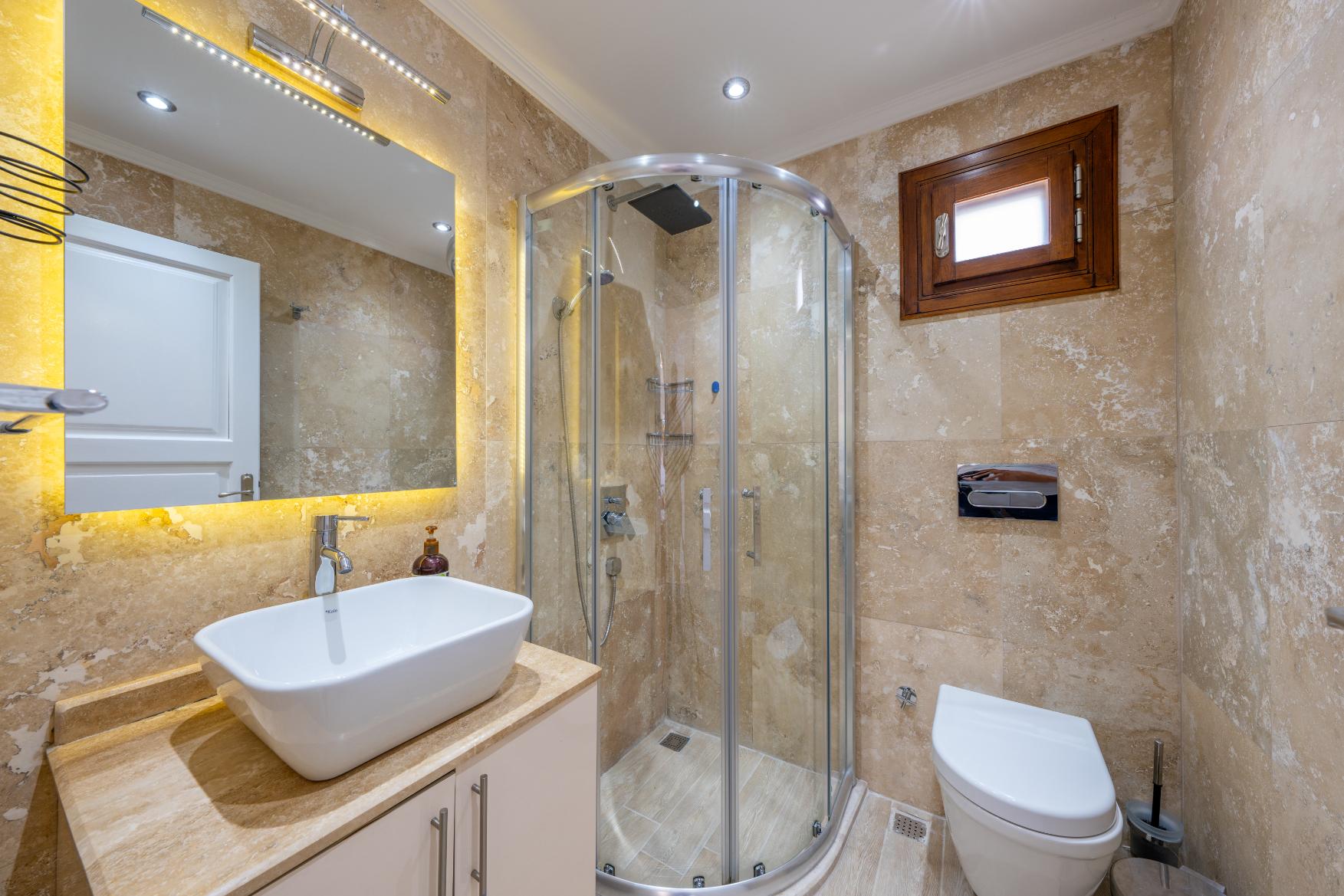 A solid antique marble staircase leads up to the Sahane’s penthouse king size master suite. This exceptionally spacious suite style bedroom complete with seating area commands spectacular sea views. All beds have very comfortable ‘Dorma’ mattress toppers to ensure guest comfort. The en suite bathroom includes a walk in shower, WC, sink and mirror. The bathroom has been fully tiled in Turkish travertine. The suite has its own private, extensive sun terrace which is furnished with sun loungers, parasol, table and chairs and private bbq.