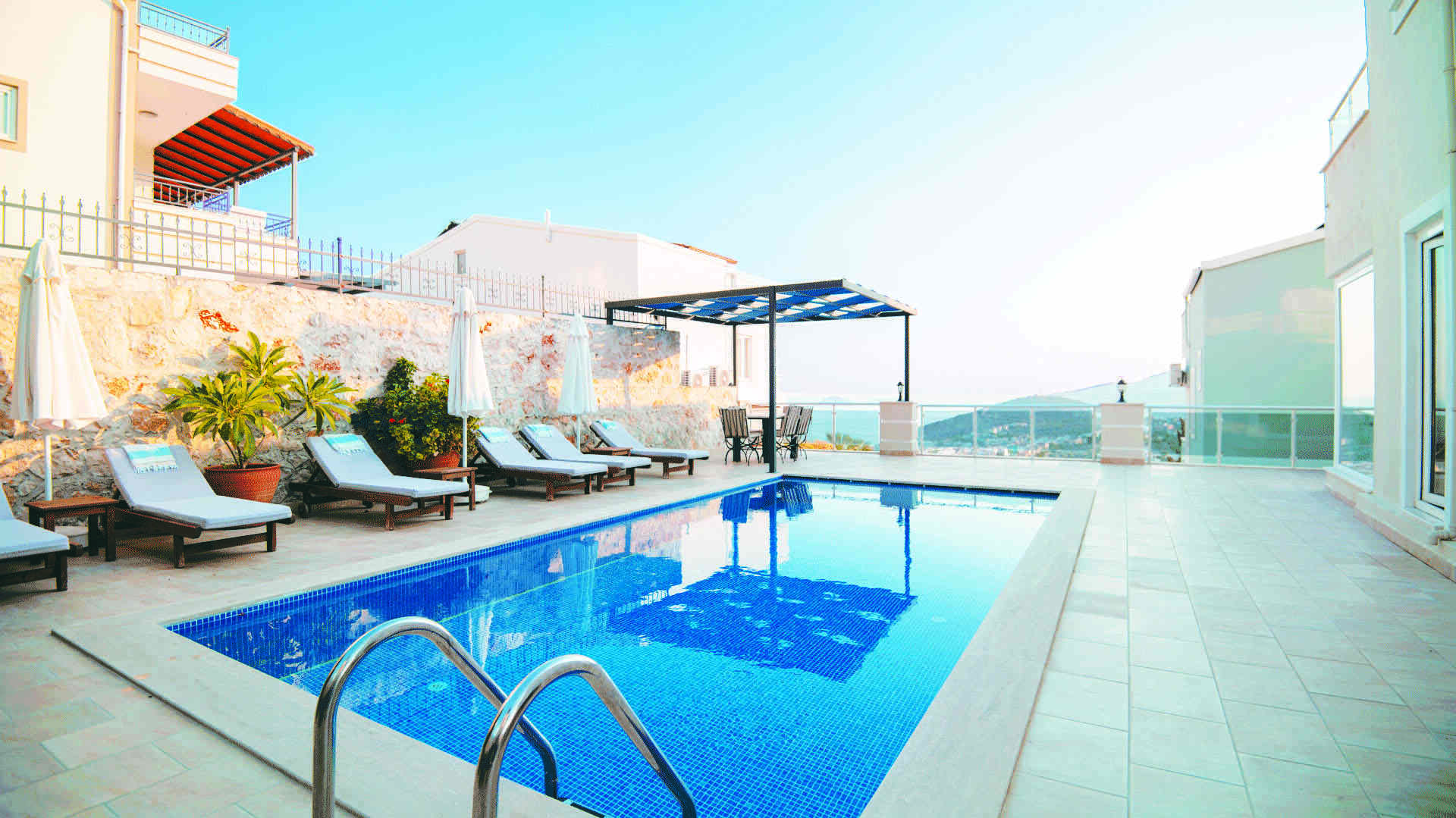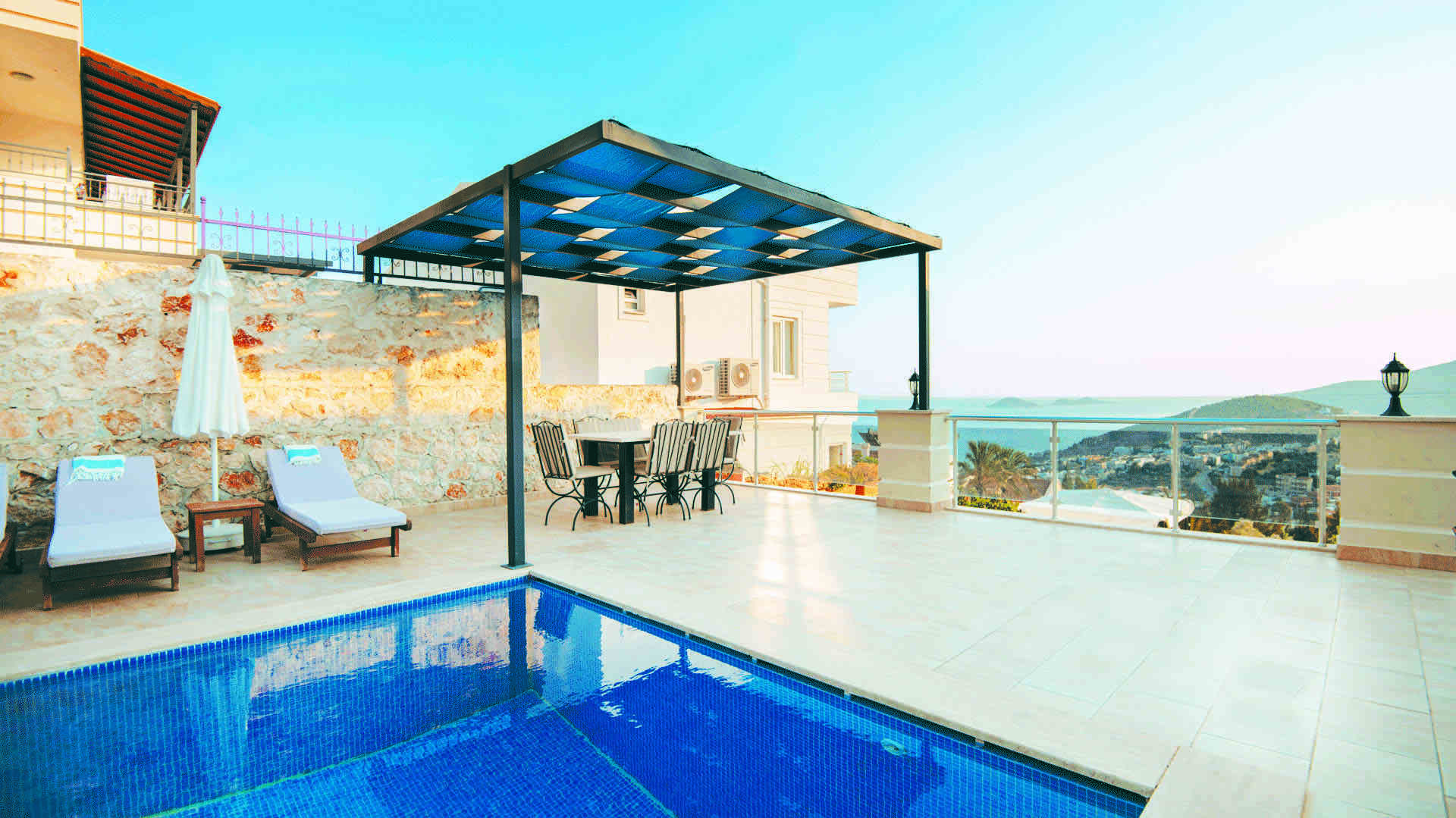 The villa has a large private swimming pool, spacious outdoor terraces plus a private roof terrace with breathtaking views.