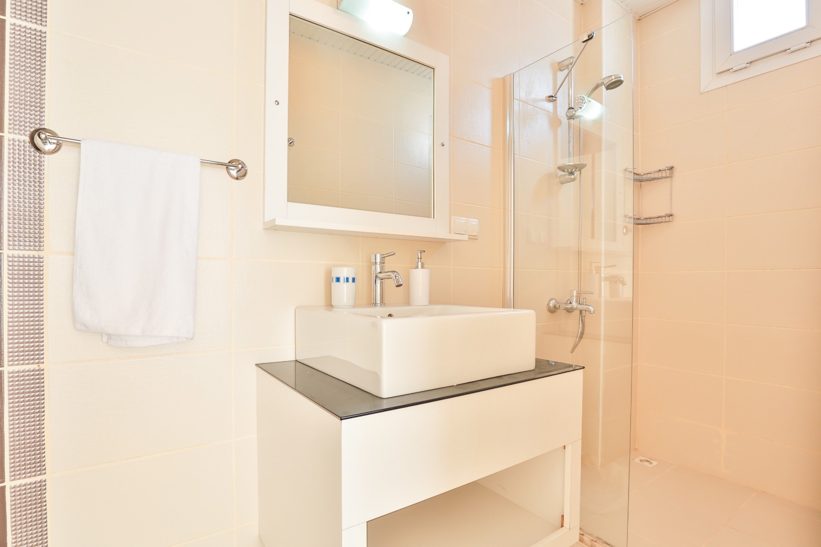 At the top of the villa there is a further, single bedroom with an adjacent shower room. As this bedroom is built into the eaves, the ceiling height is limited in some areas.
