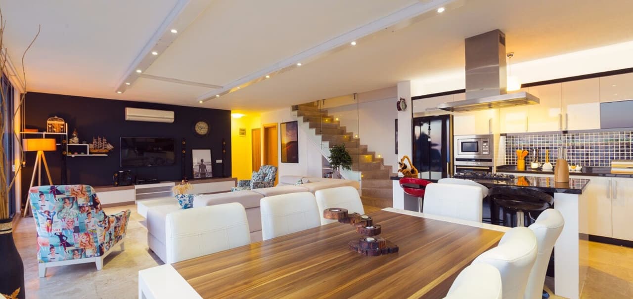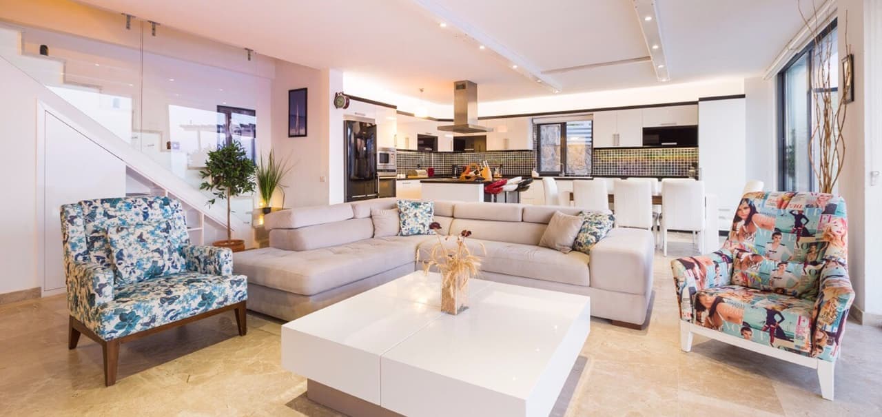 The spacious open plan living area at Villa Ela consists of the kitchen, dining area and lounge.