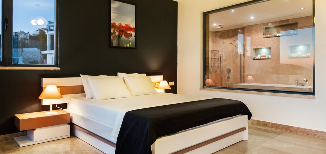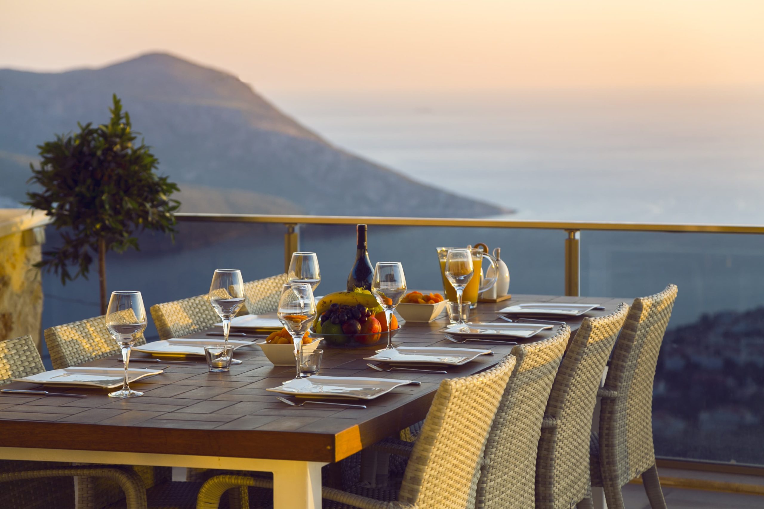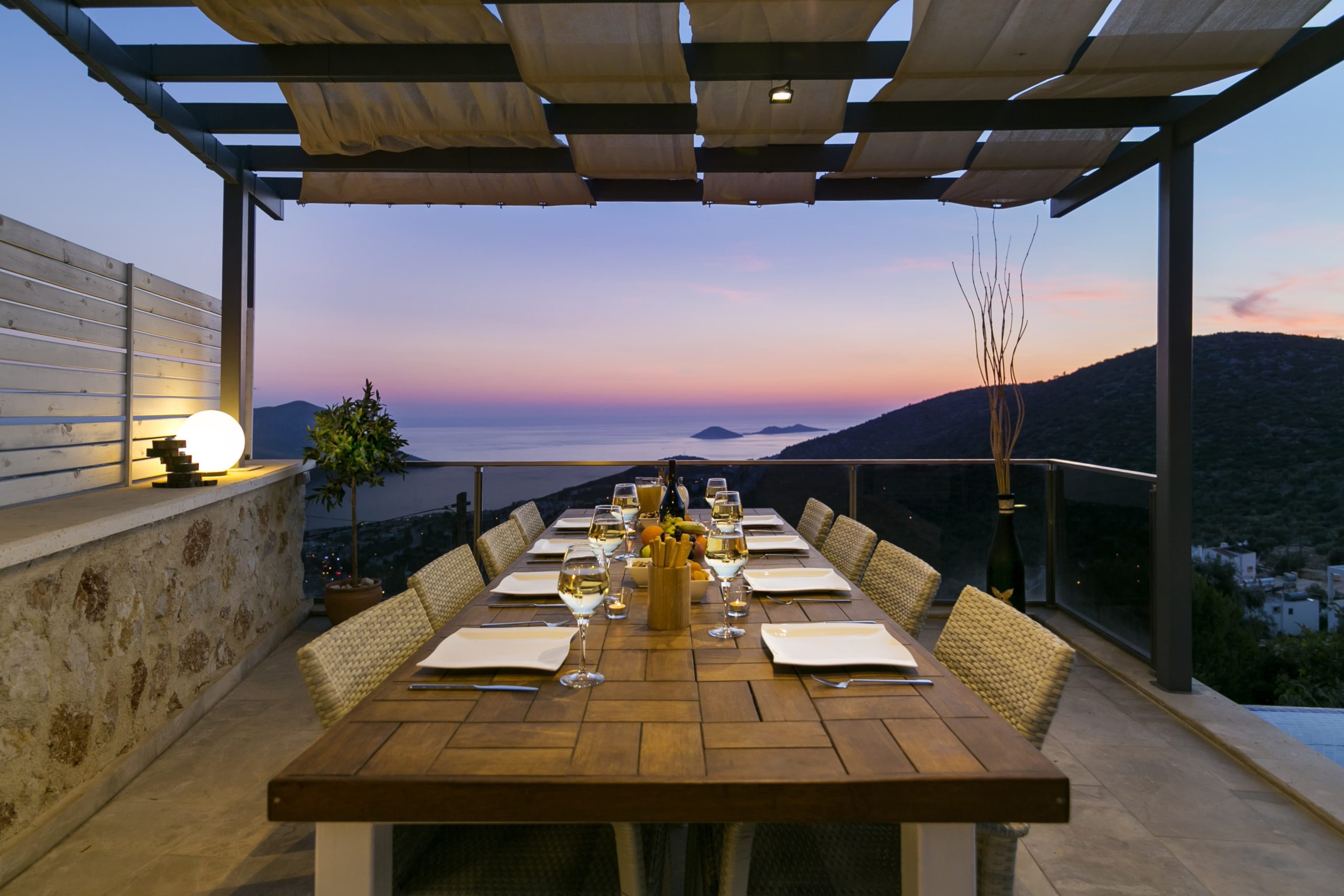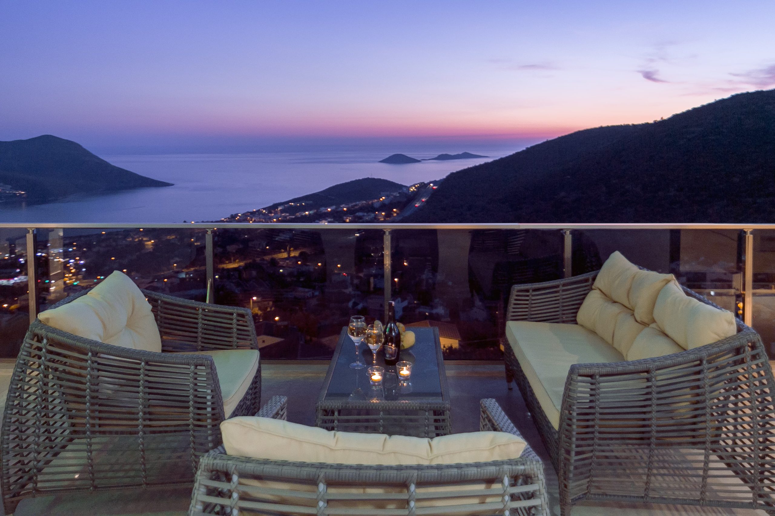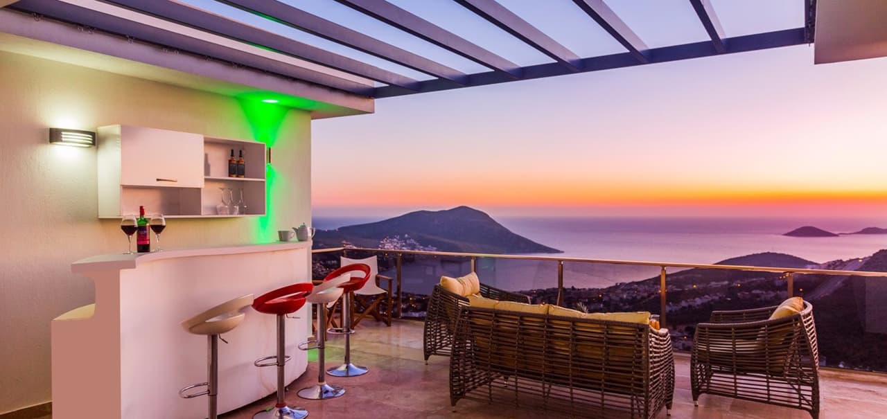 The villas roof terrace is located on this floor with a bar area complete with barstools, rattan furniture and breathtaking views over Kalkan.