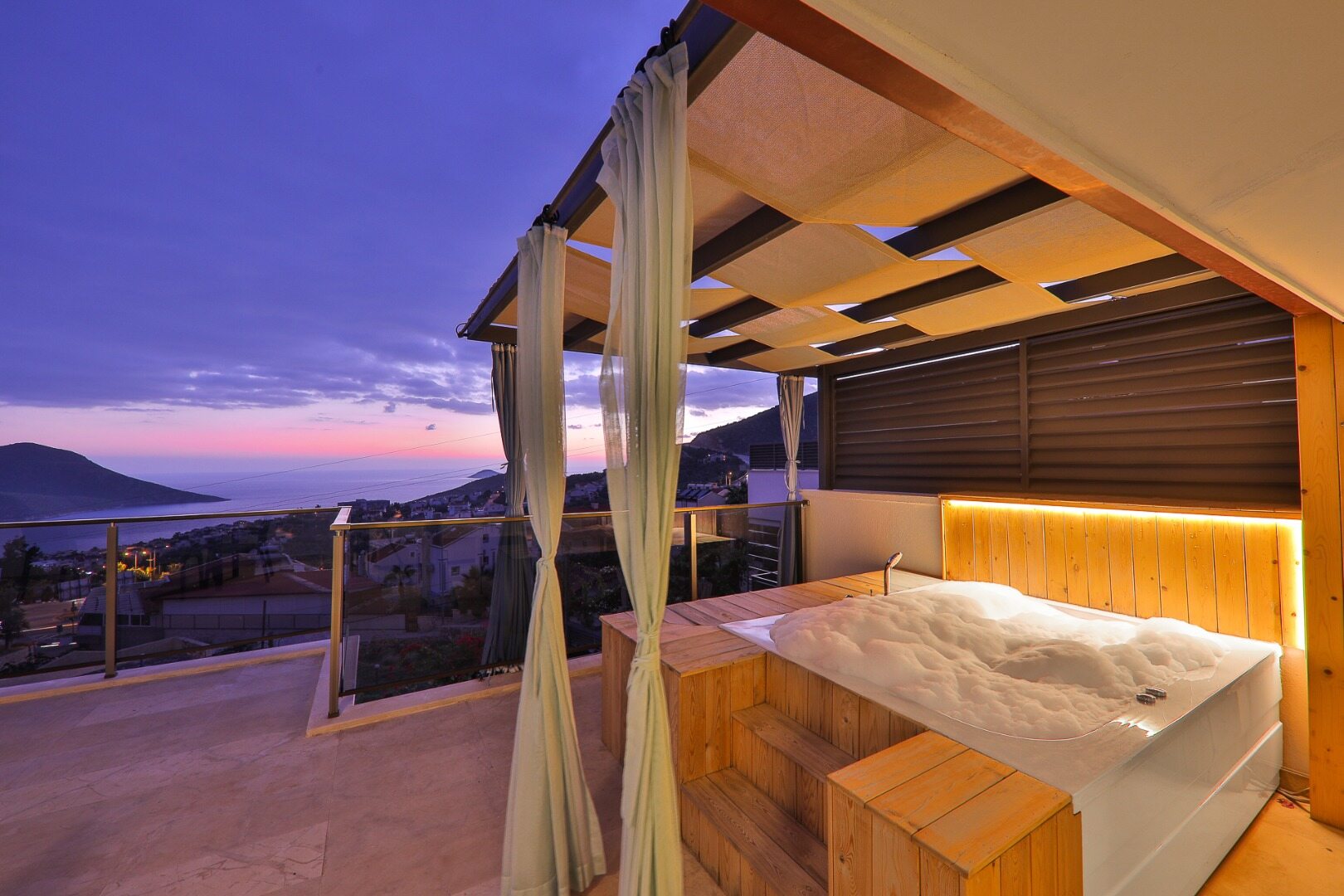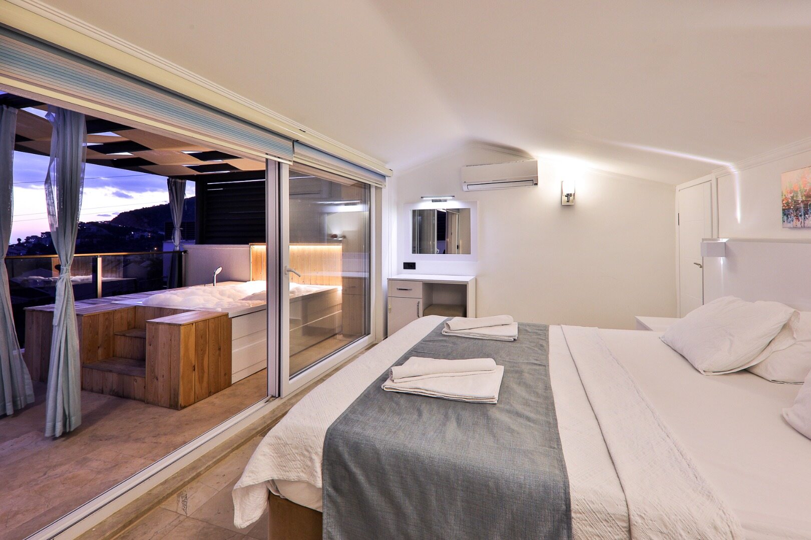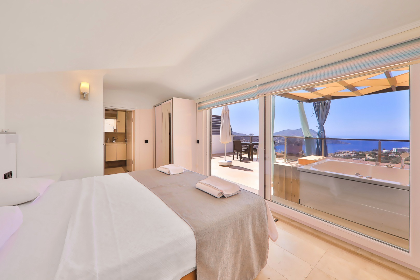 This bedroom also boasts a private balcony with a jacuzzi and stunning views over Kalkan Bay.