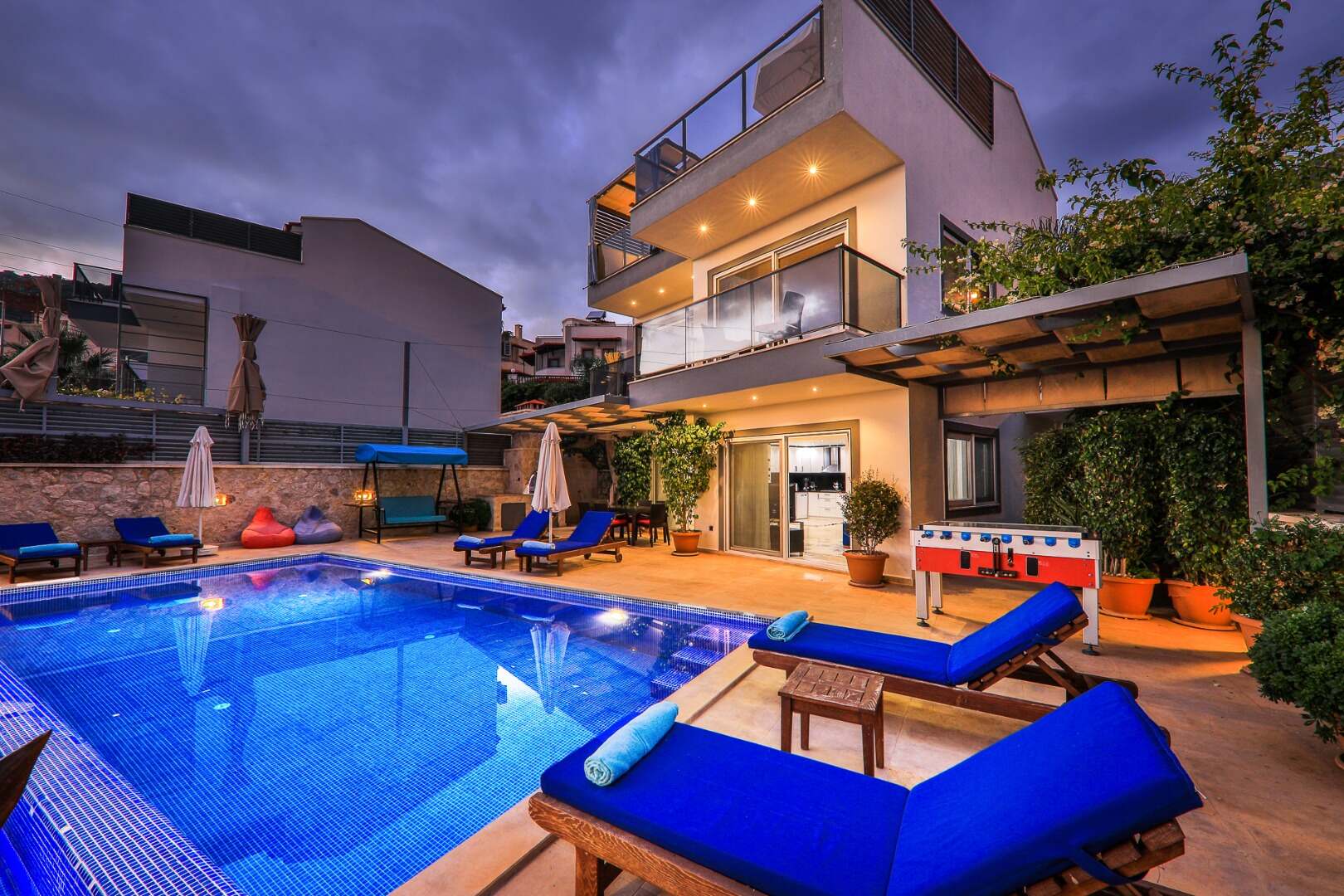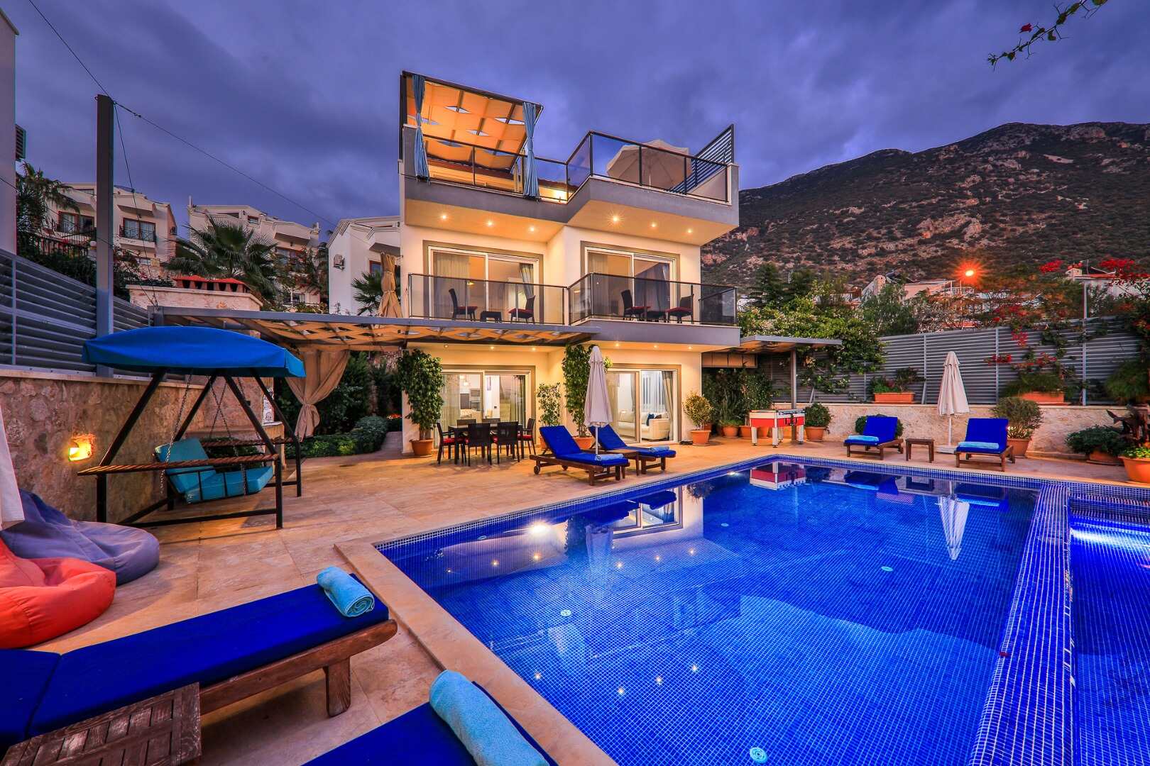 - Amenities: BBQ, Dish Washer, Hair Dryer, HDTV, Kettle, Microwave, Outdoor Dining Set, Parasols, Pool Towels, Sun Loungers, Swing Seat, Table Football, Washing Machine, Wi-Fi