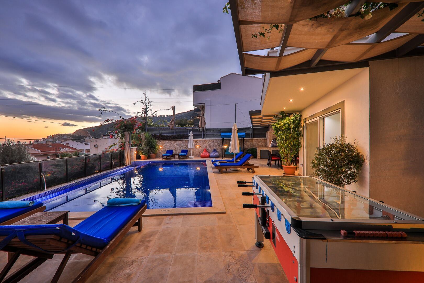 Sliding doors lead out to a shaded dining table. There are also both a Fußball table and table tennis in this area.
