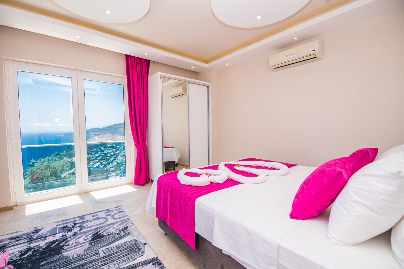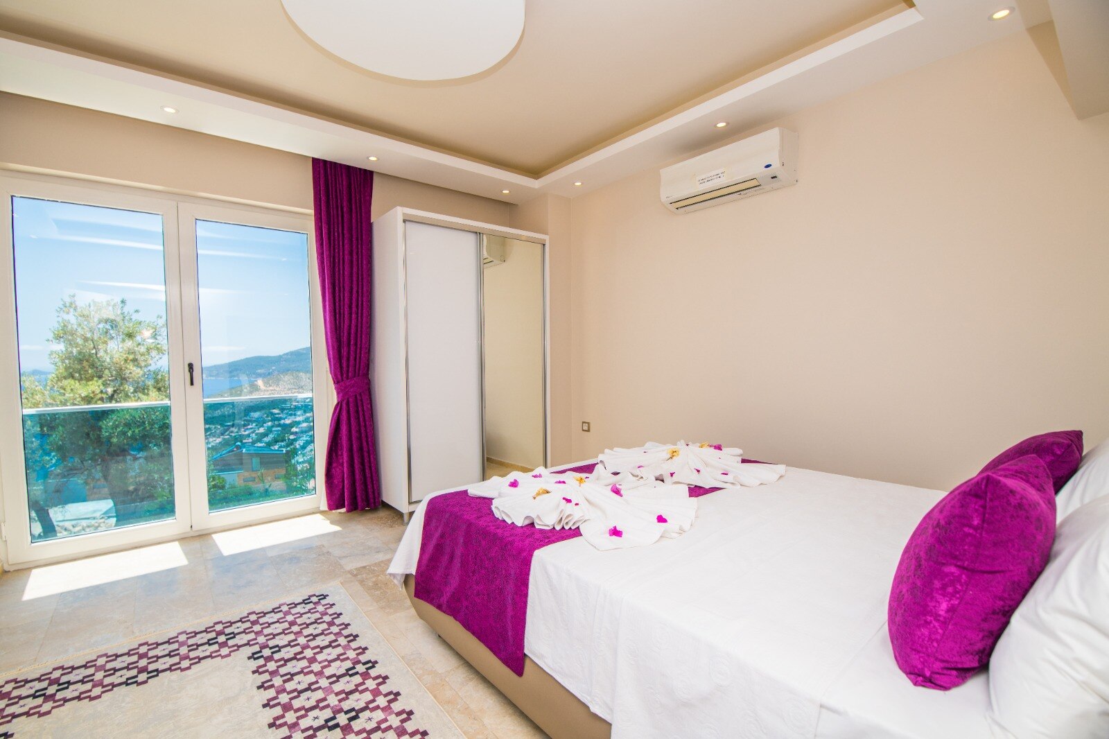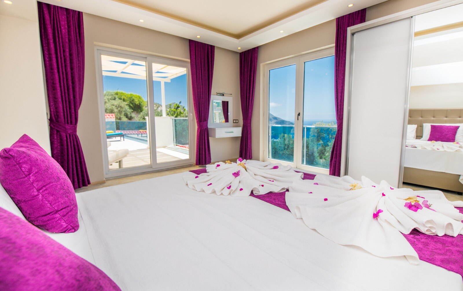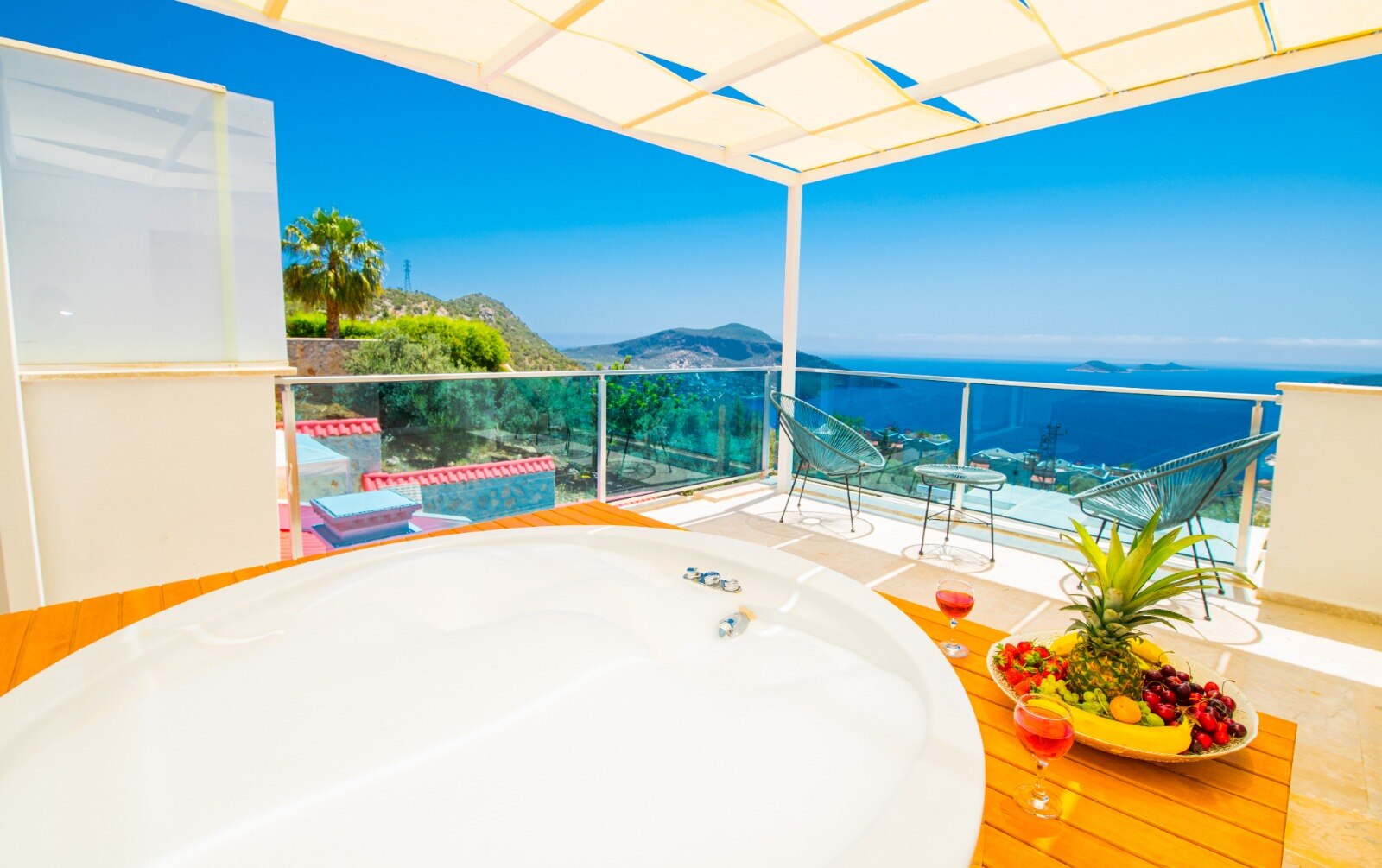 This bedroom also boasts a private balcony with jacuzzi and stunning views over Kalkan Bay.