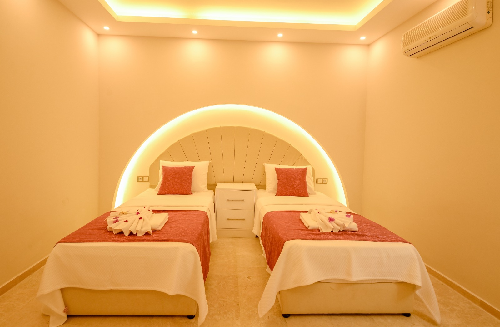 Bedroom 2; twin beds, wardrobe, bedside table, air conditioning.