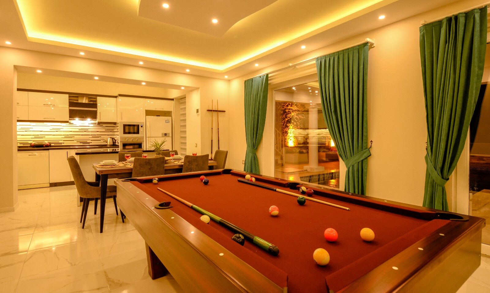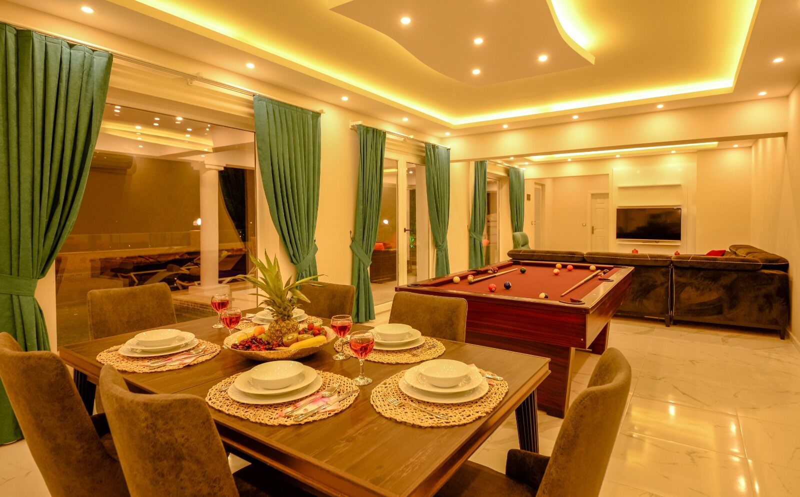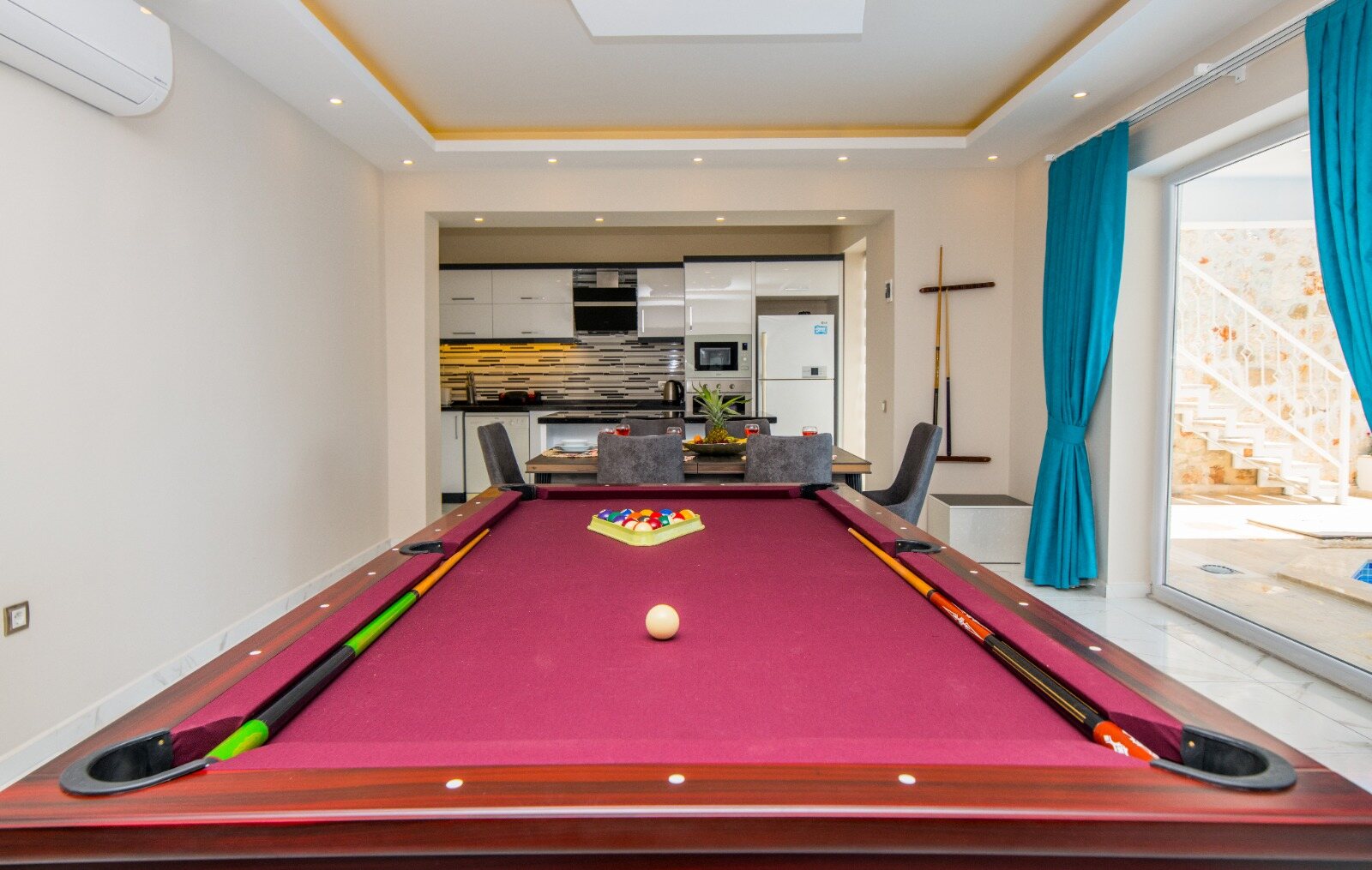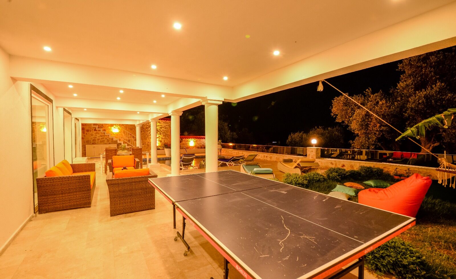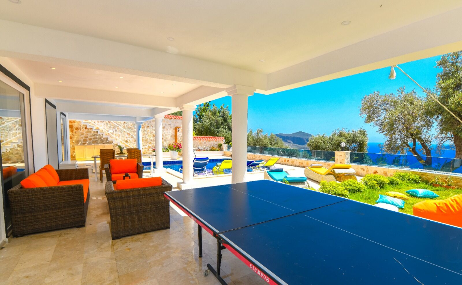 Sliding doors lead out to a shaded dining table and the large pool terrace and garden, incuding a table tennis table.