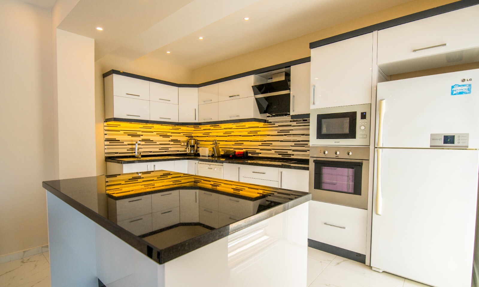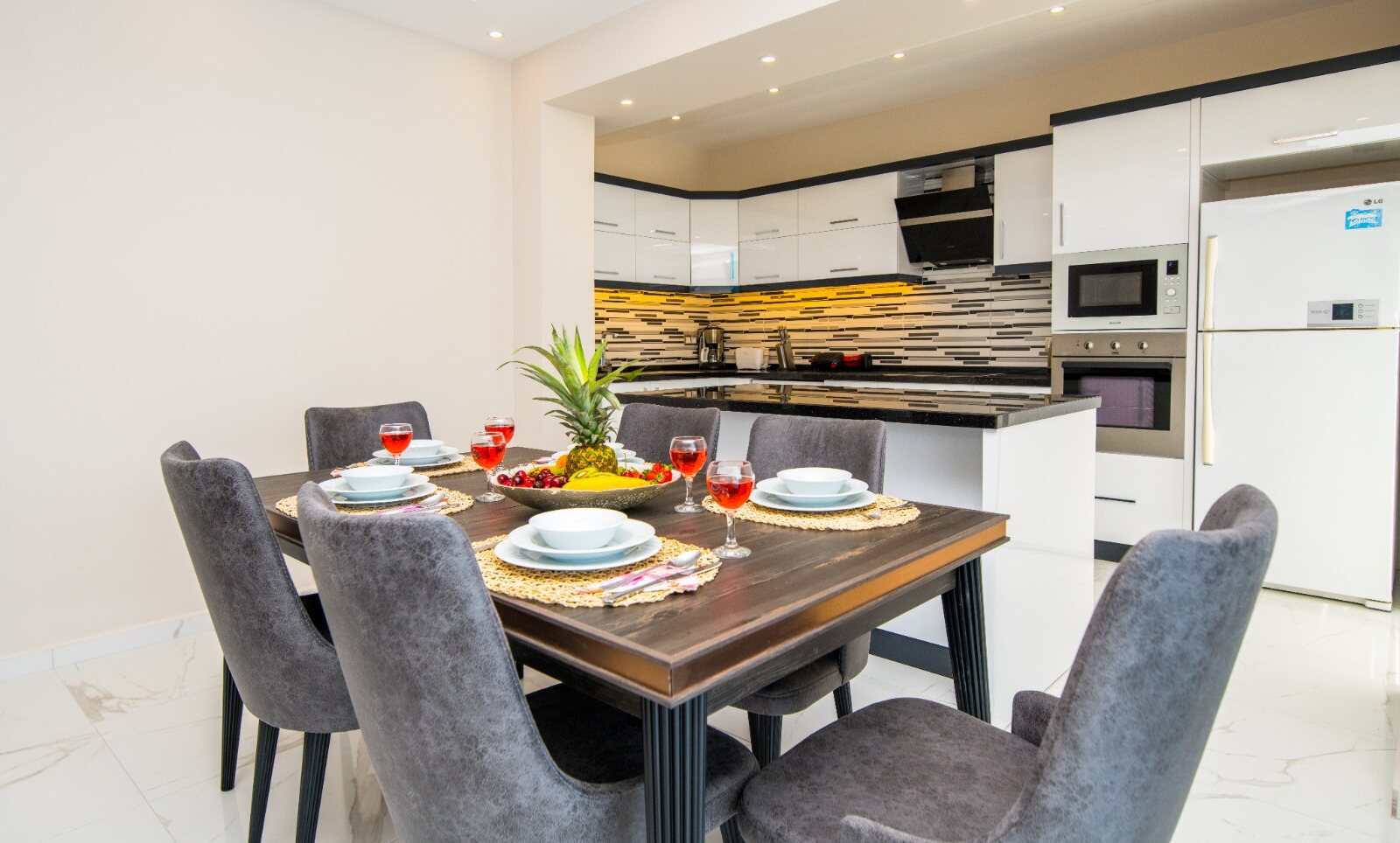 Modern Kitchen with dishwasher, large refrigerator, microwave oven, 4-burner stove, oven, electric kettle, water cooler pots, pans, dinnerware, cutlery, tea, coffee and a dining table.