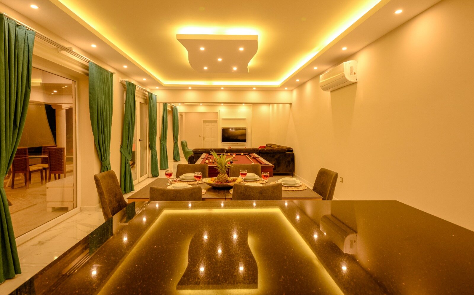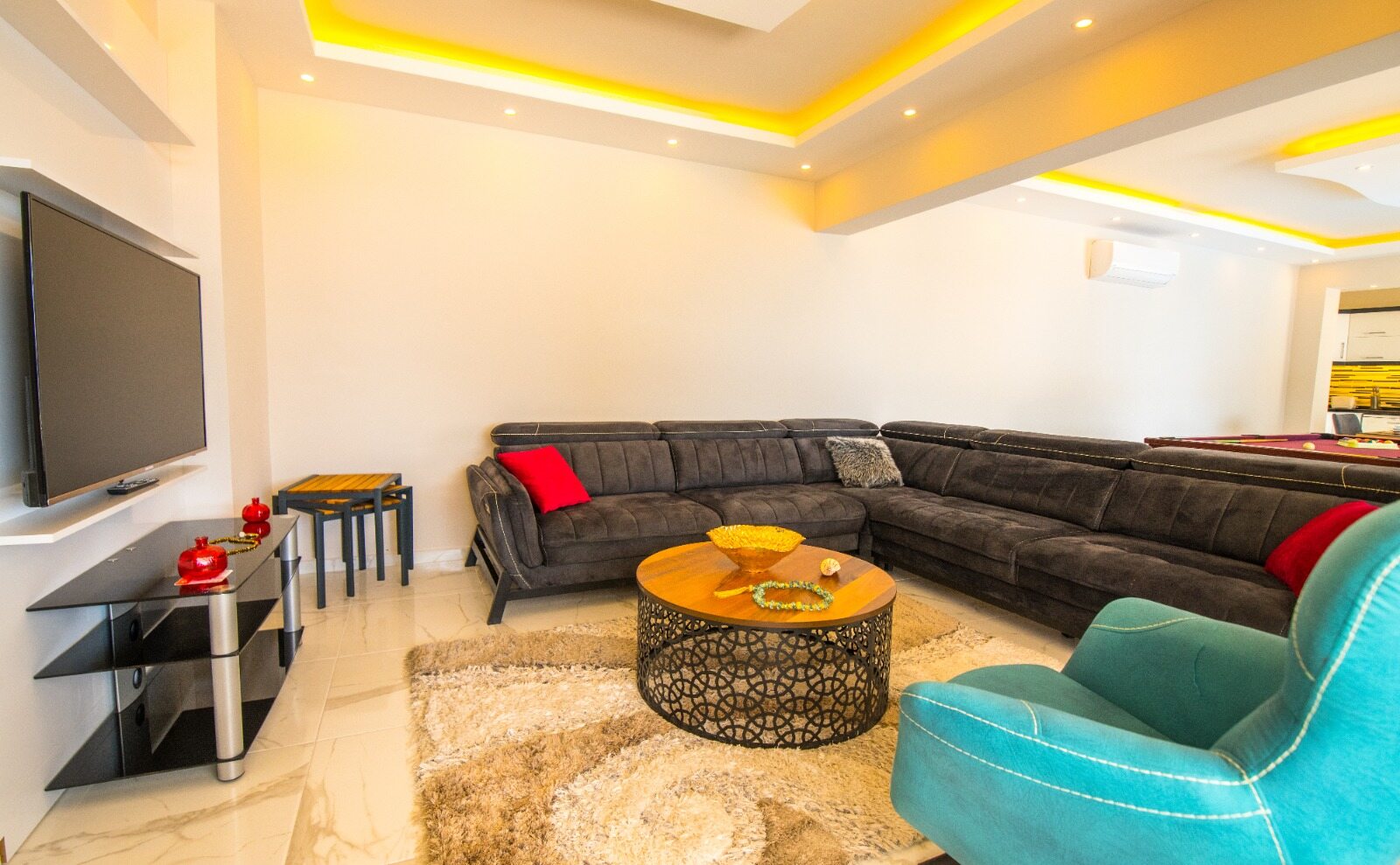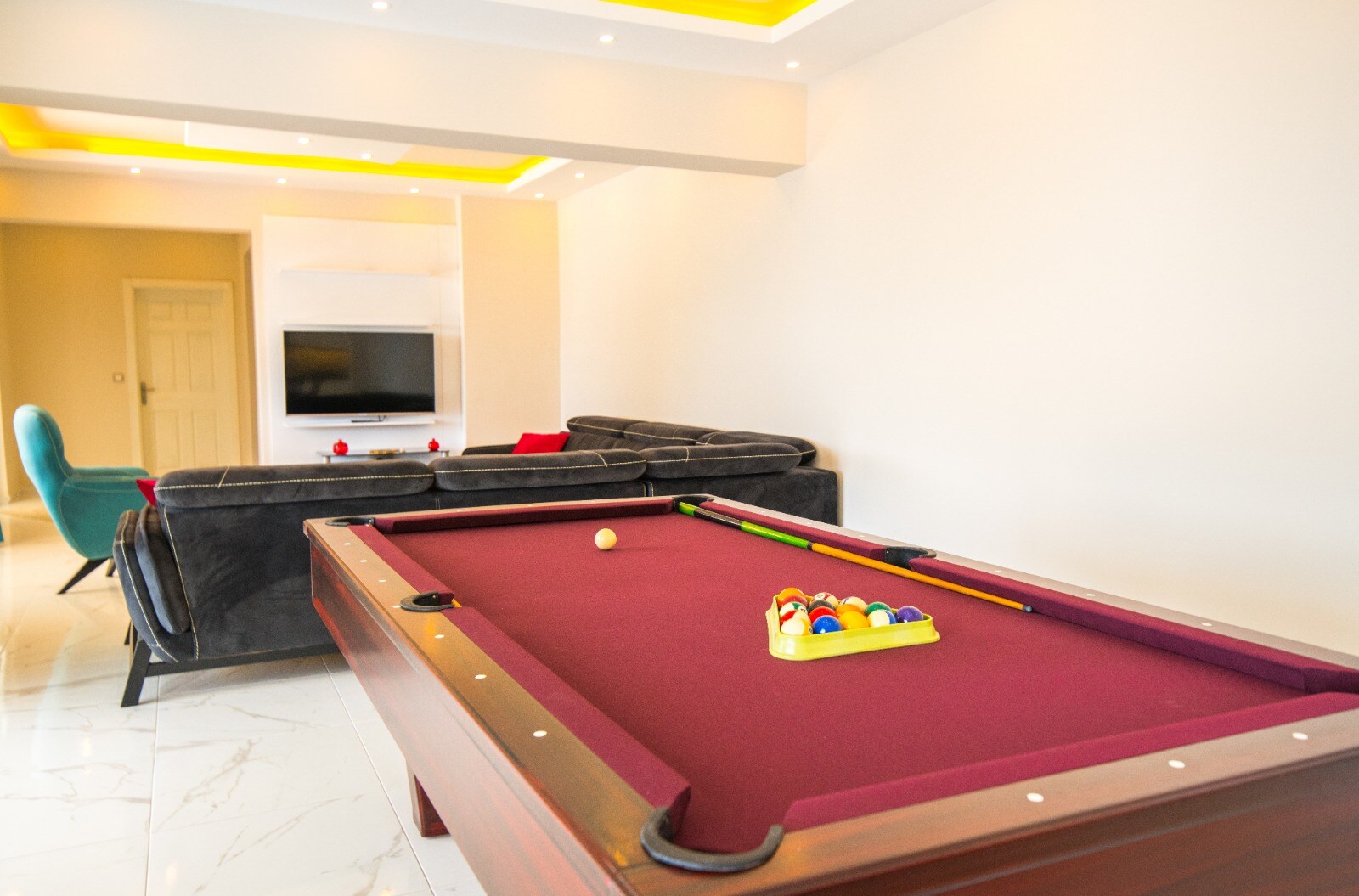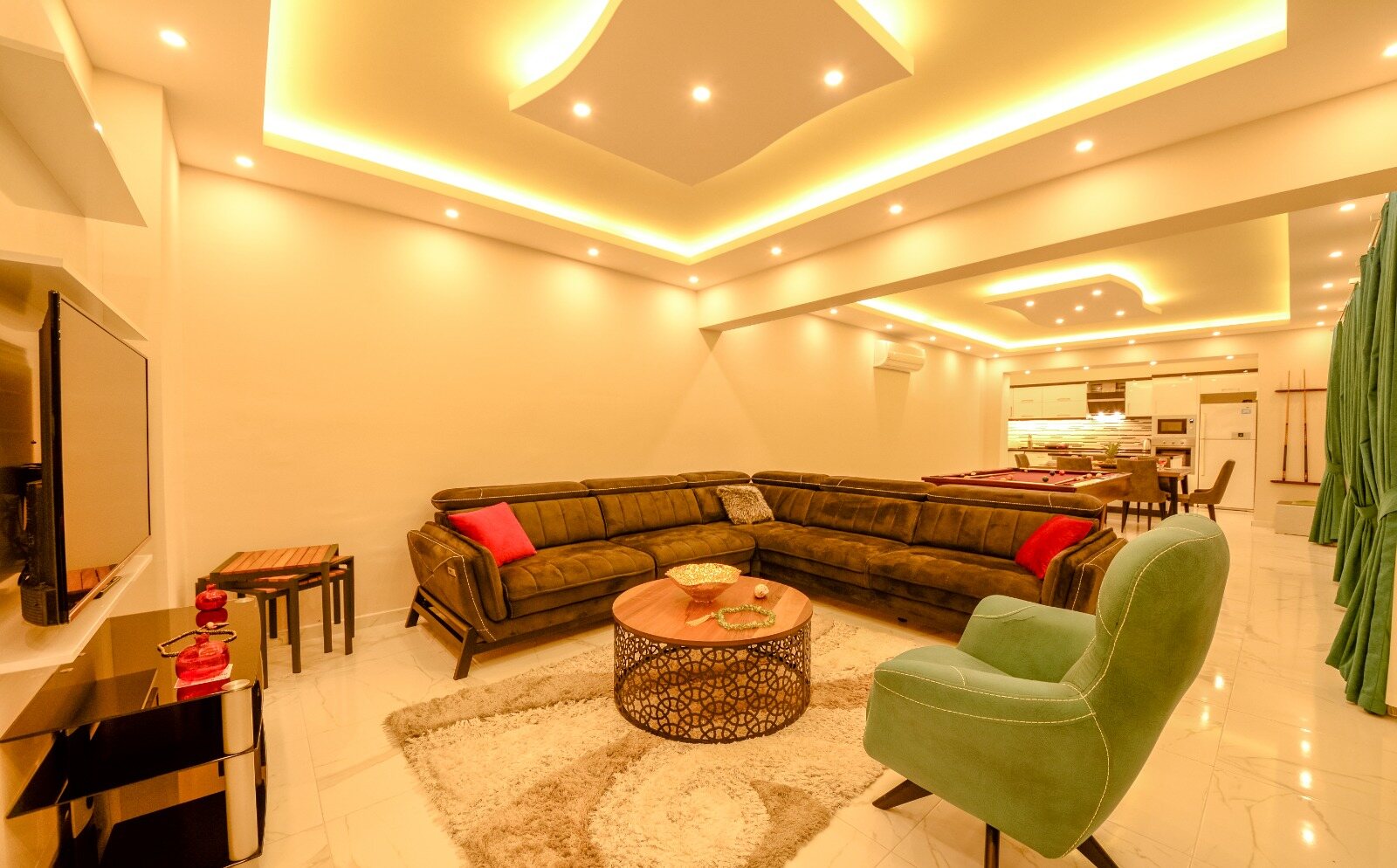 Living room boasts a full size pool table and has a large modern seating group, HDTV, air conditioning.