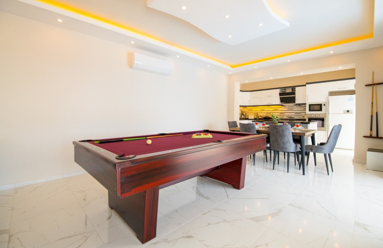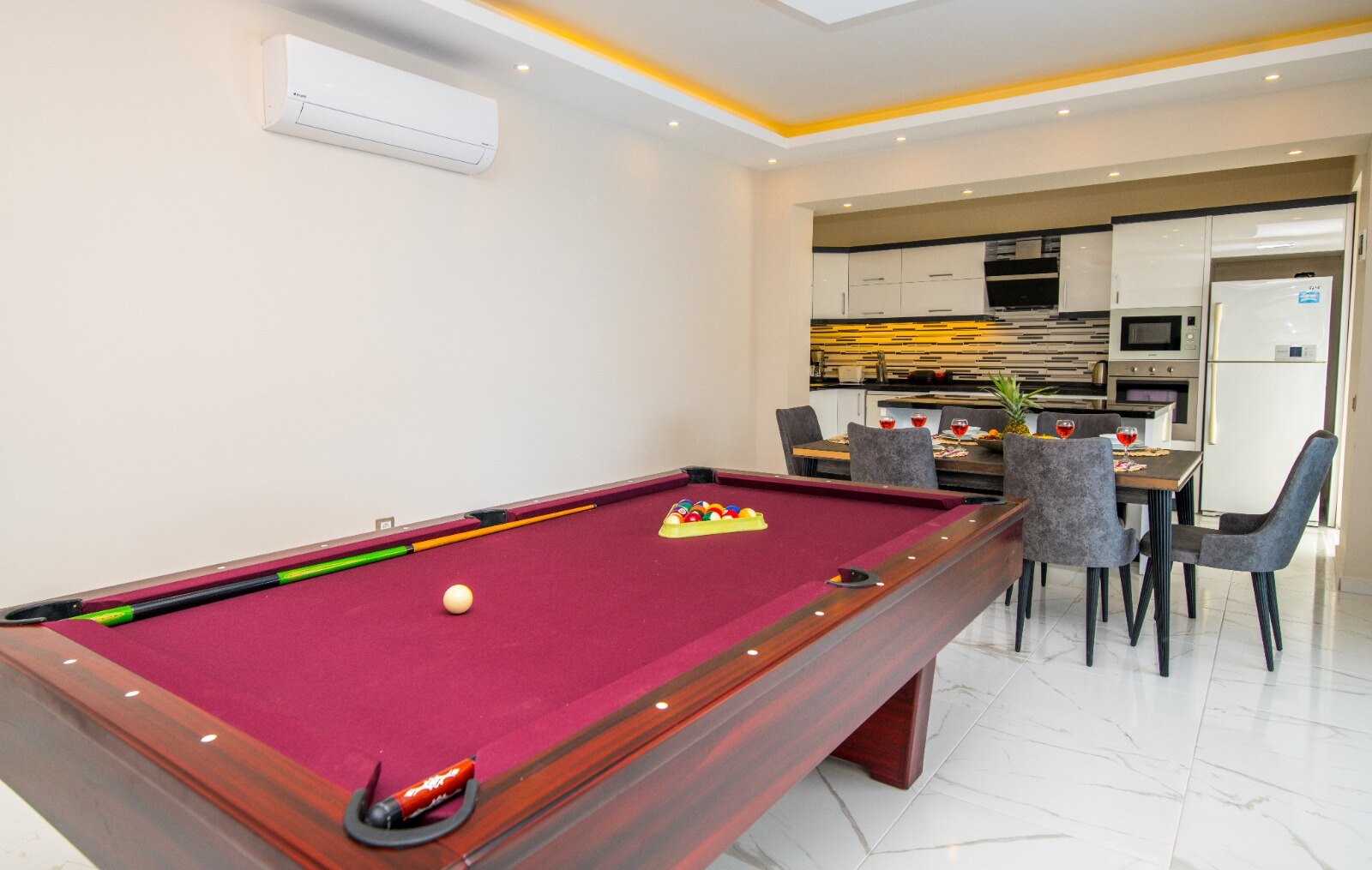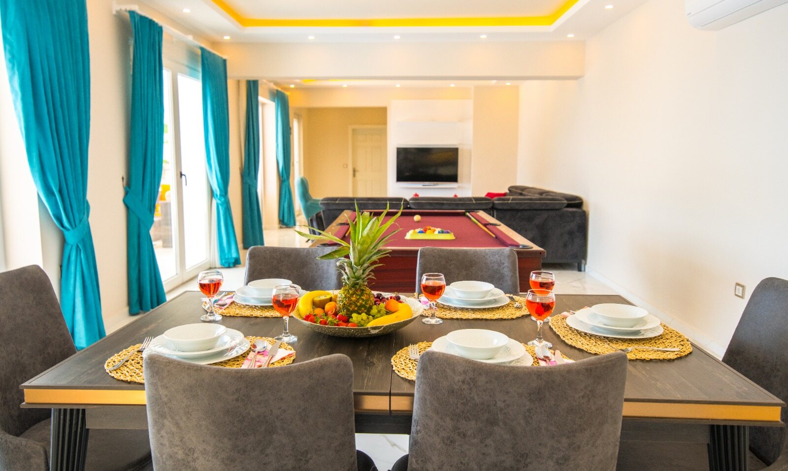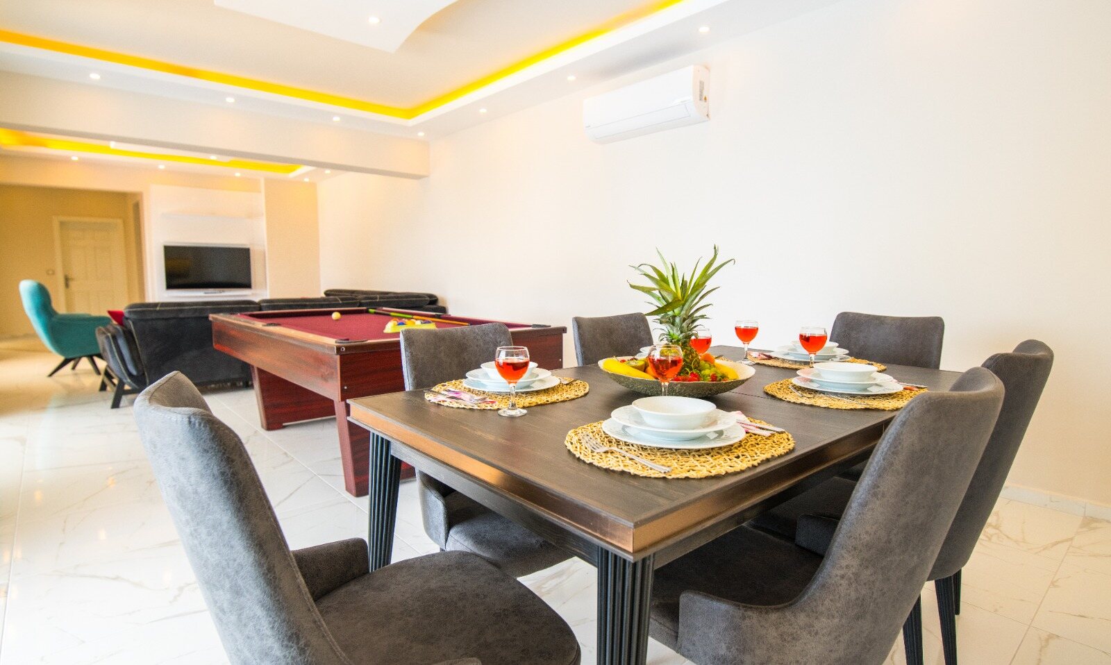 Living room boasts a full size pool table and has a large modern seating group, HDTV, air conditioning.