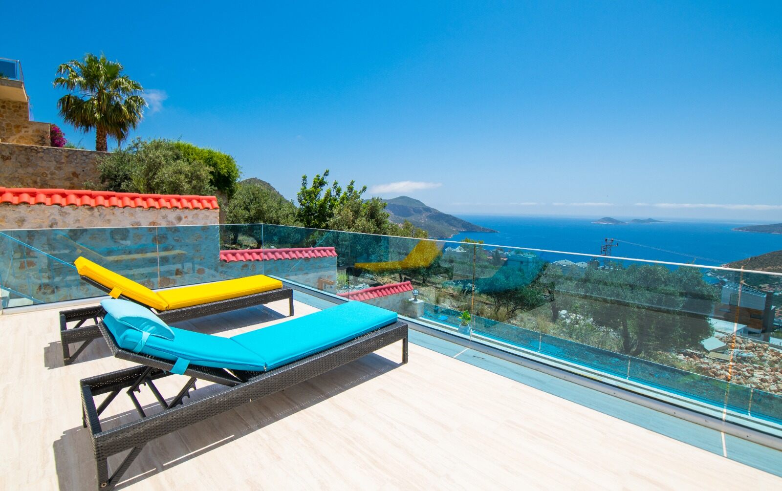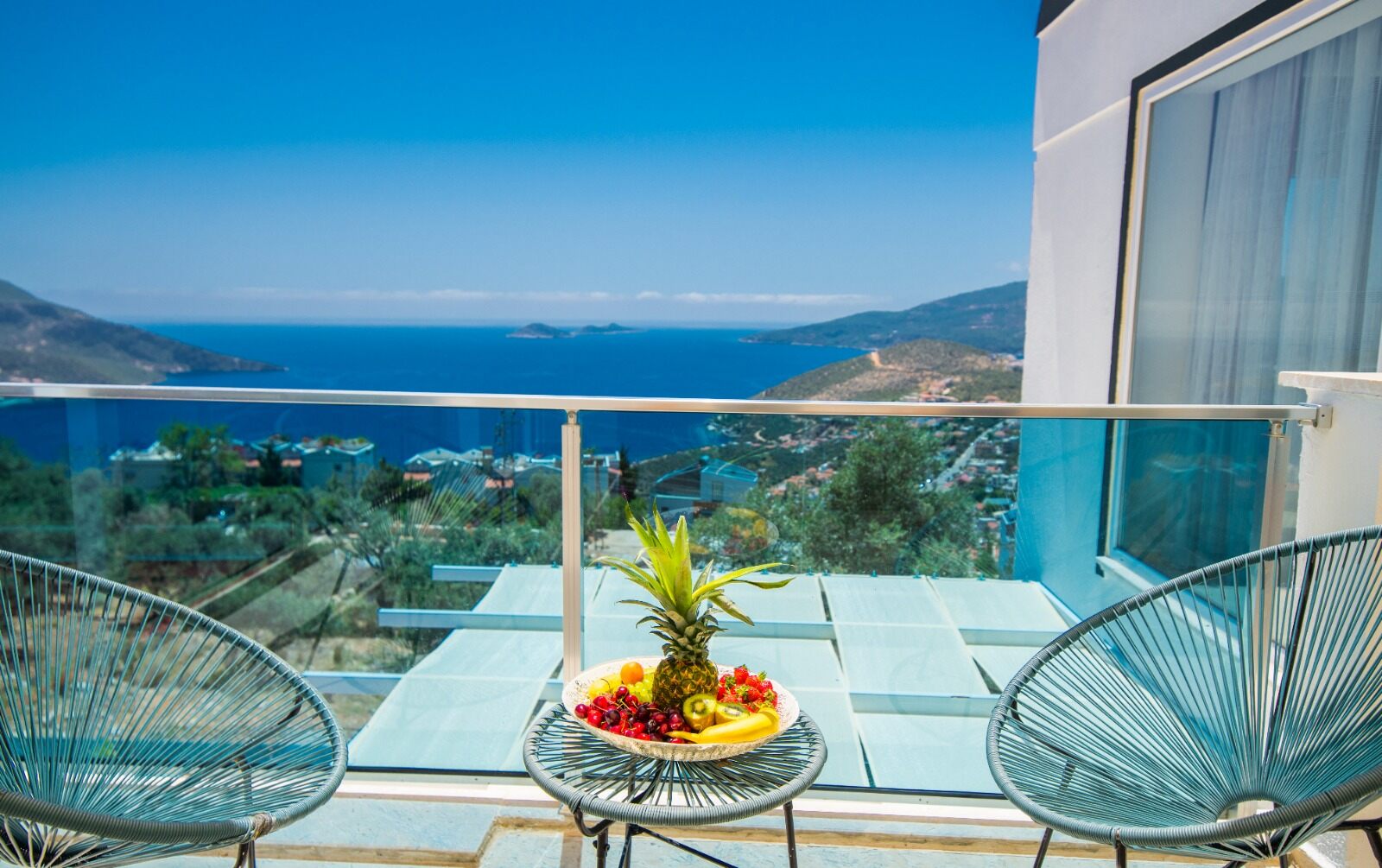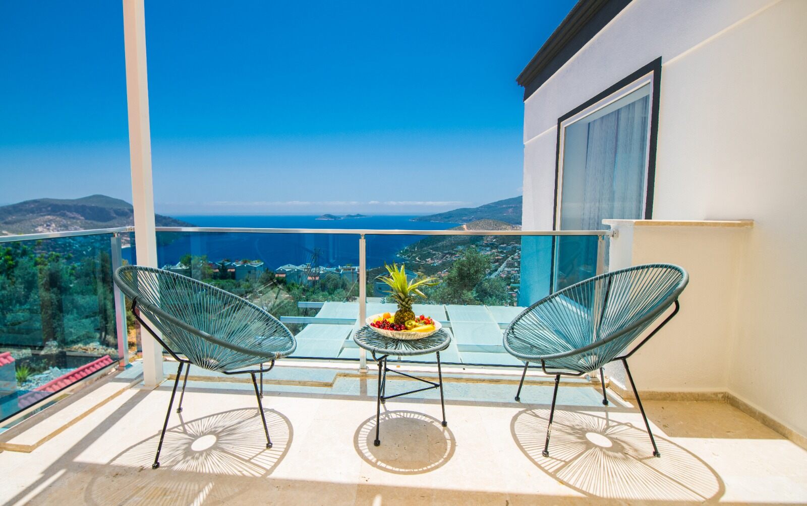Both have access to a large balcony with stunning views over Kalkan Bay.