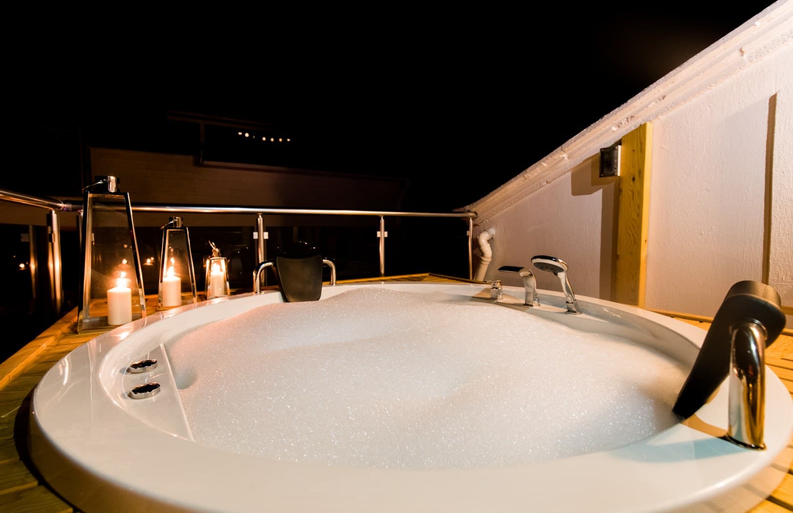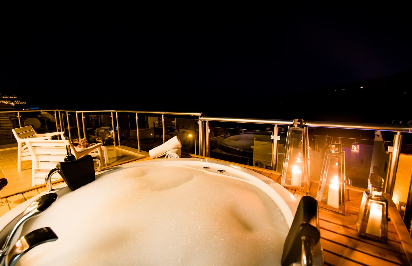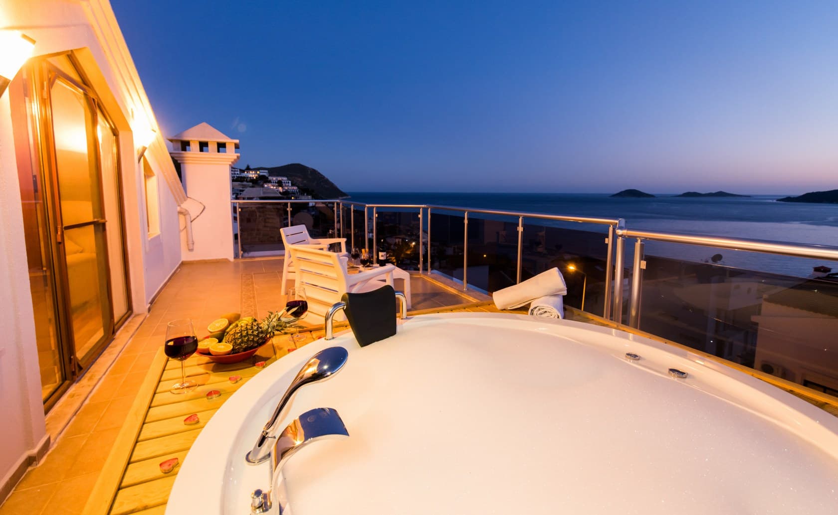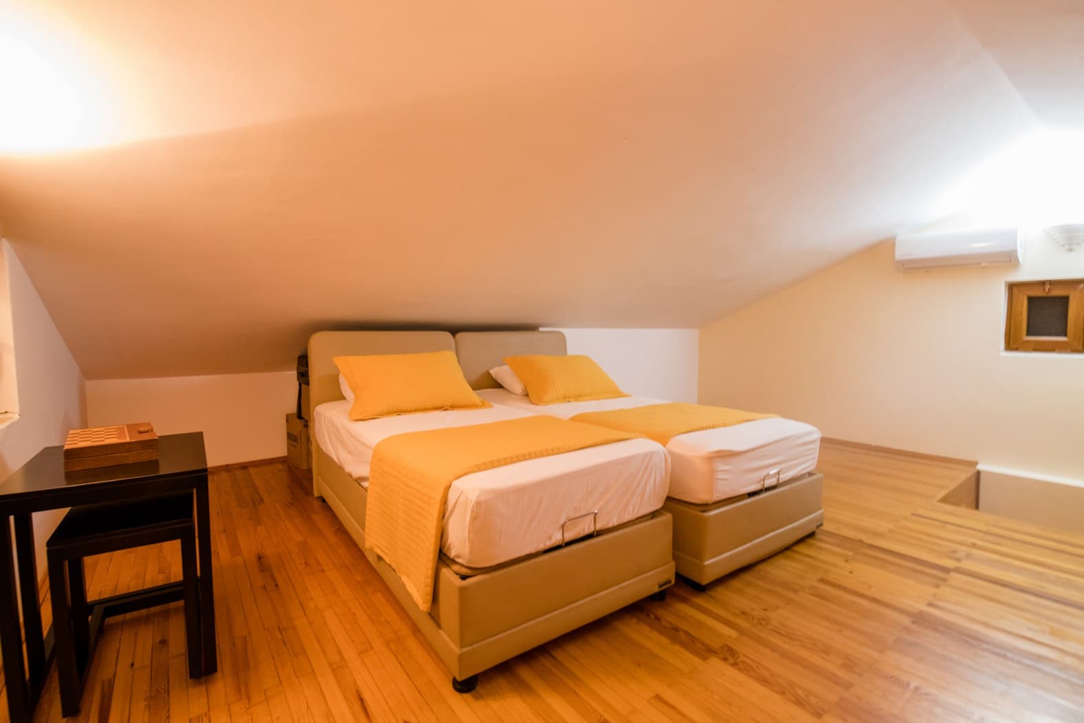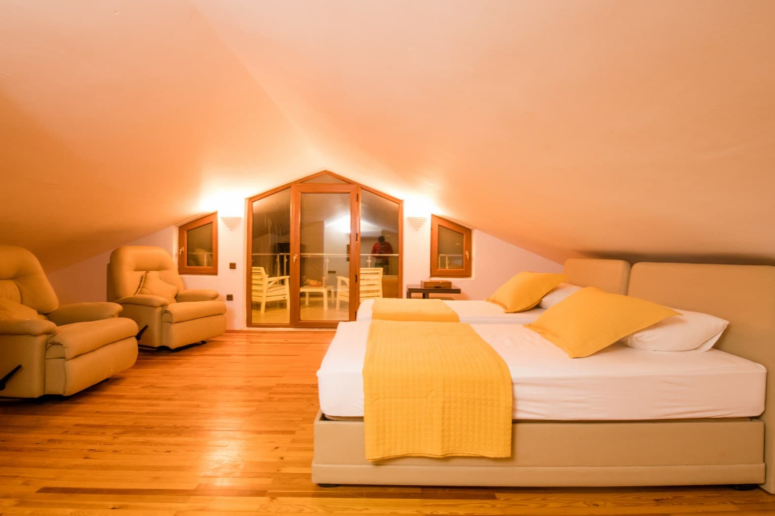 Twin bedroom ; Twin beds, 2 reclining chairs and doors leading out onto the roof terrace which includes a seating area and a roof top jacuzzi with spectacular views.