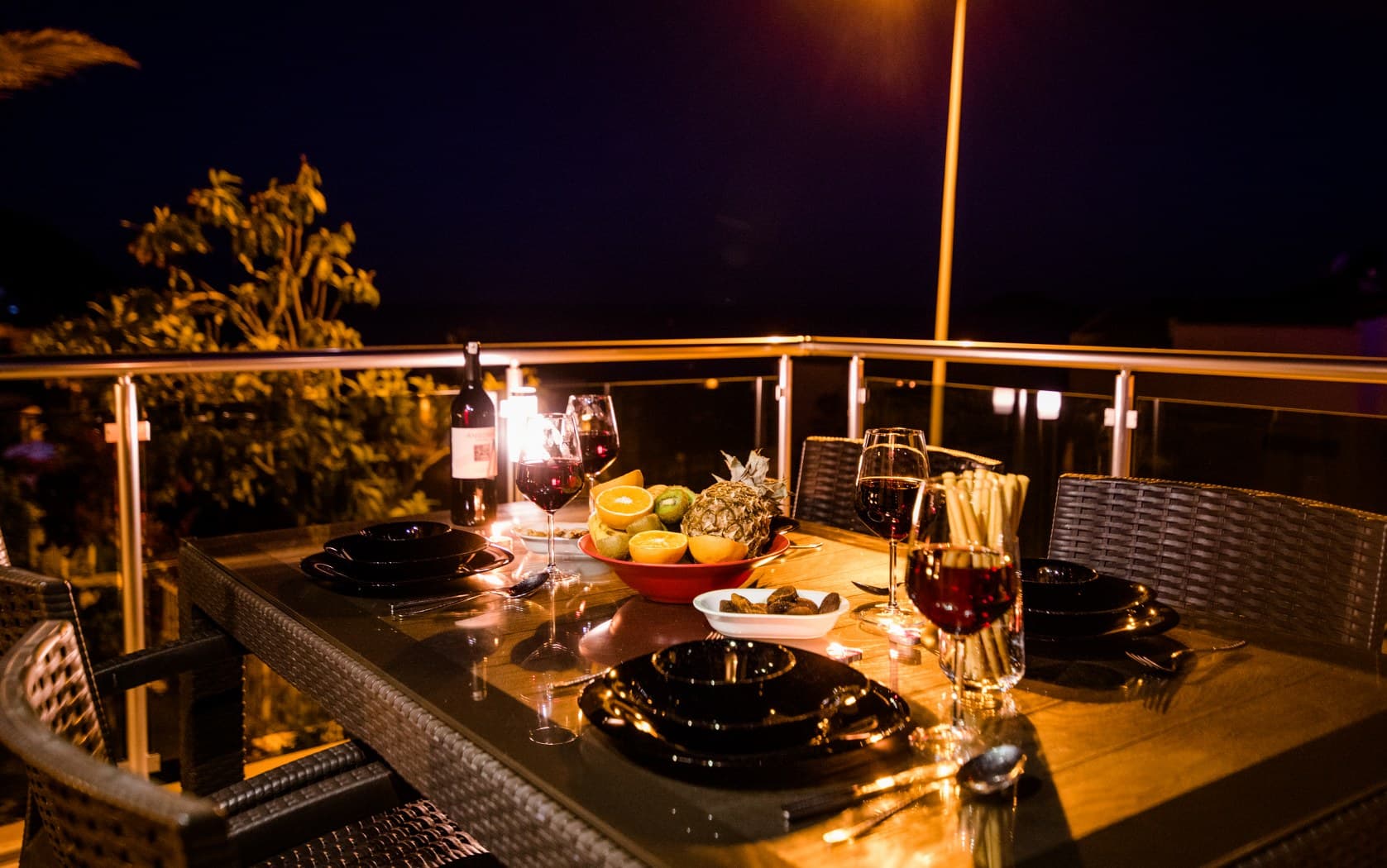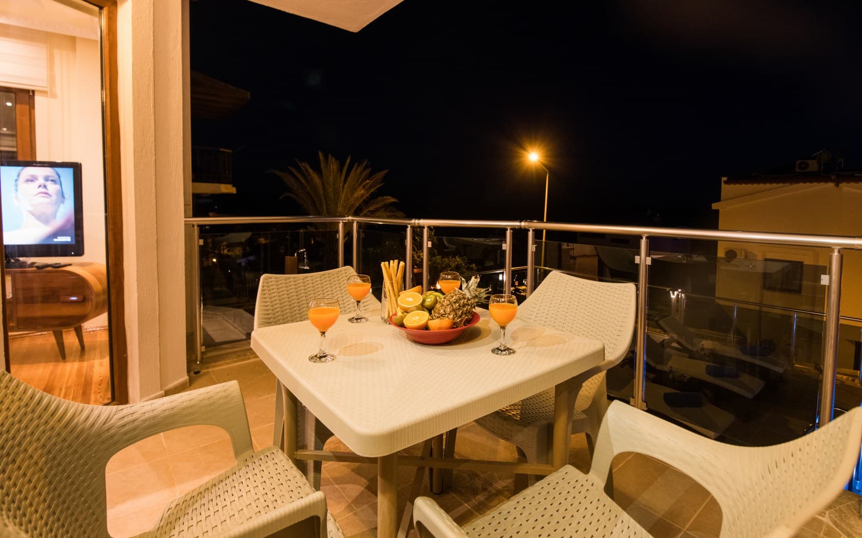 Sliding doors lead out to a balcony with an outdoor dining table.