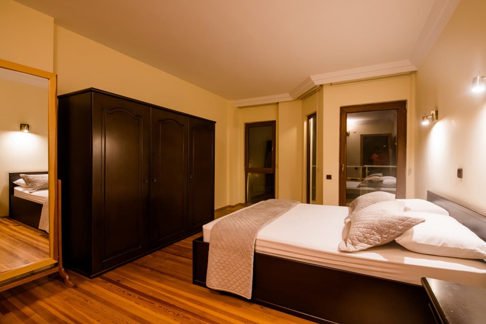 double bed, large wardrobe, chest of drawers, full length mirror and en-suite shower room.
