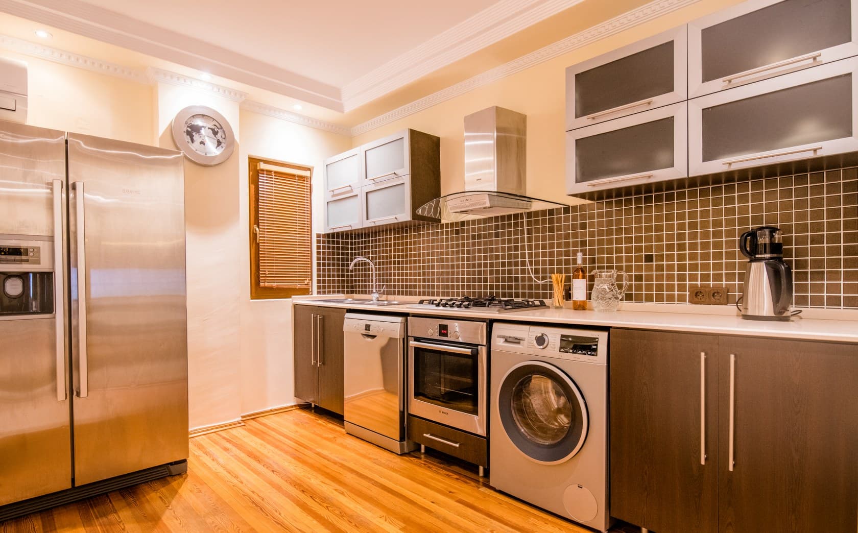 Modern Kitchen including dishwasher, large refrigerator and a washing machine.