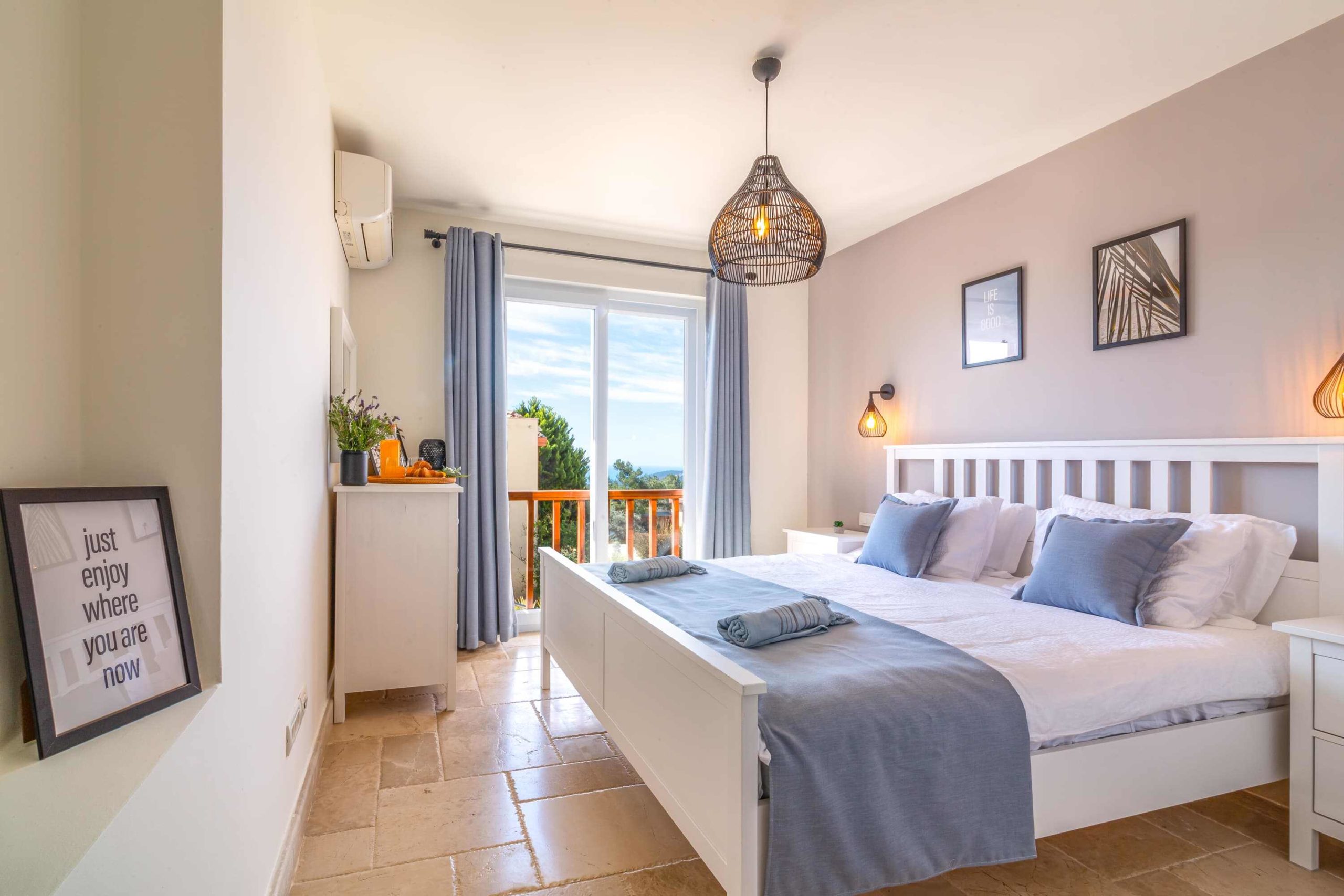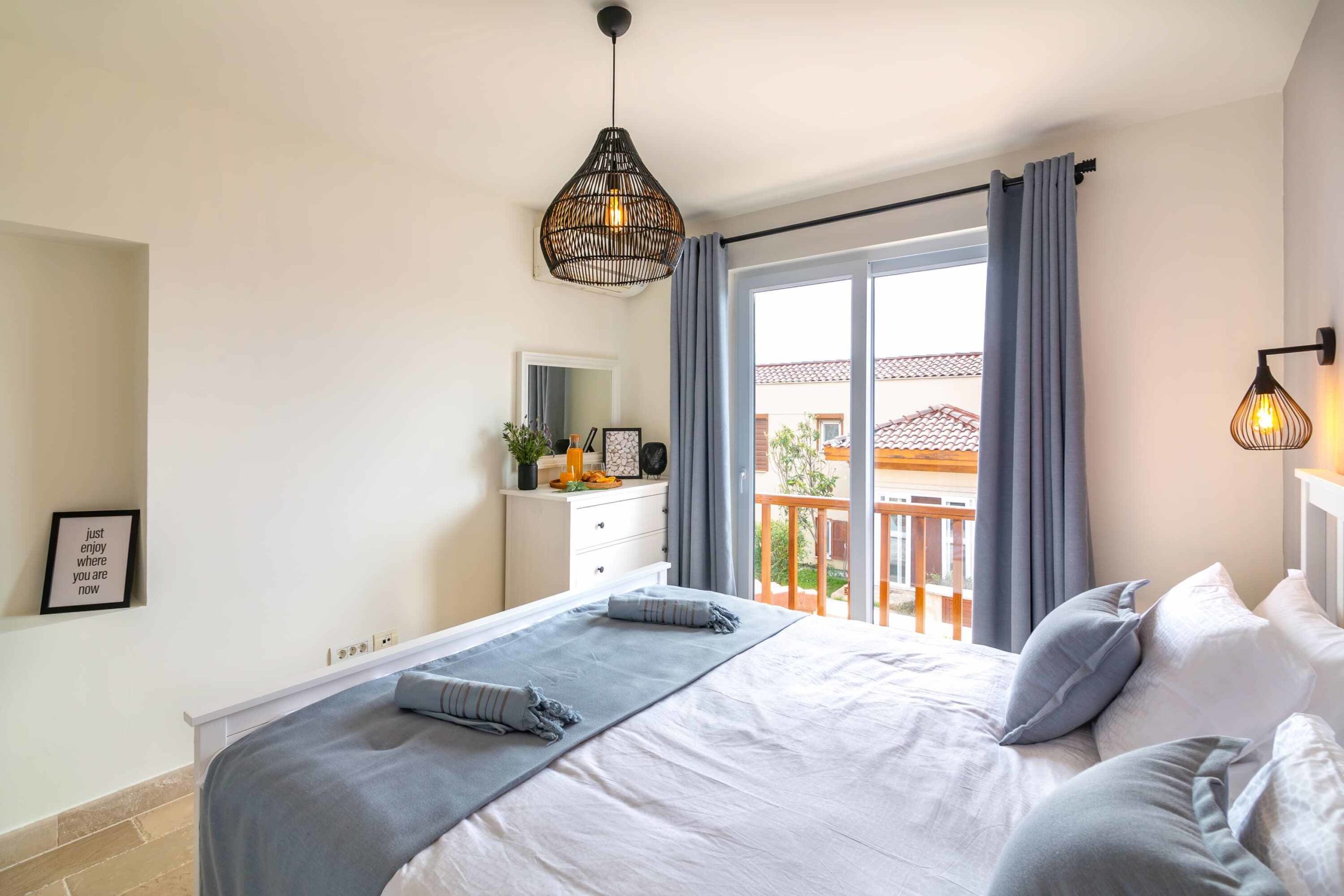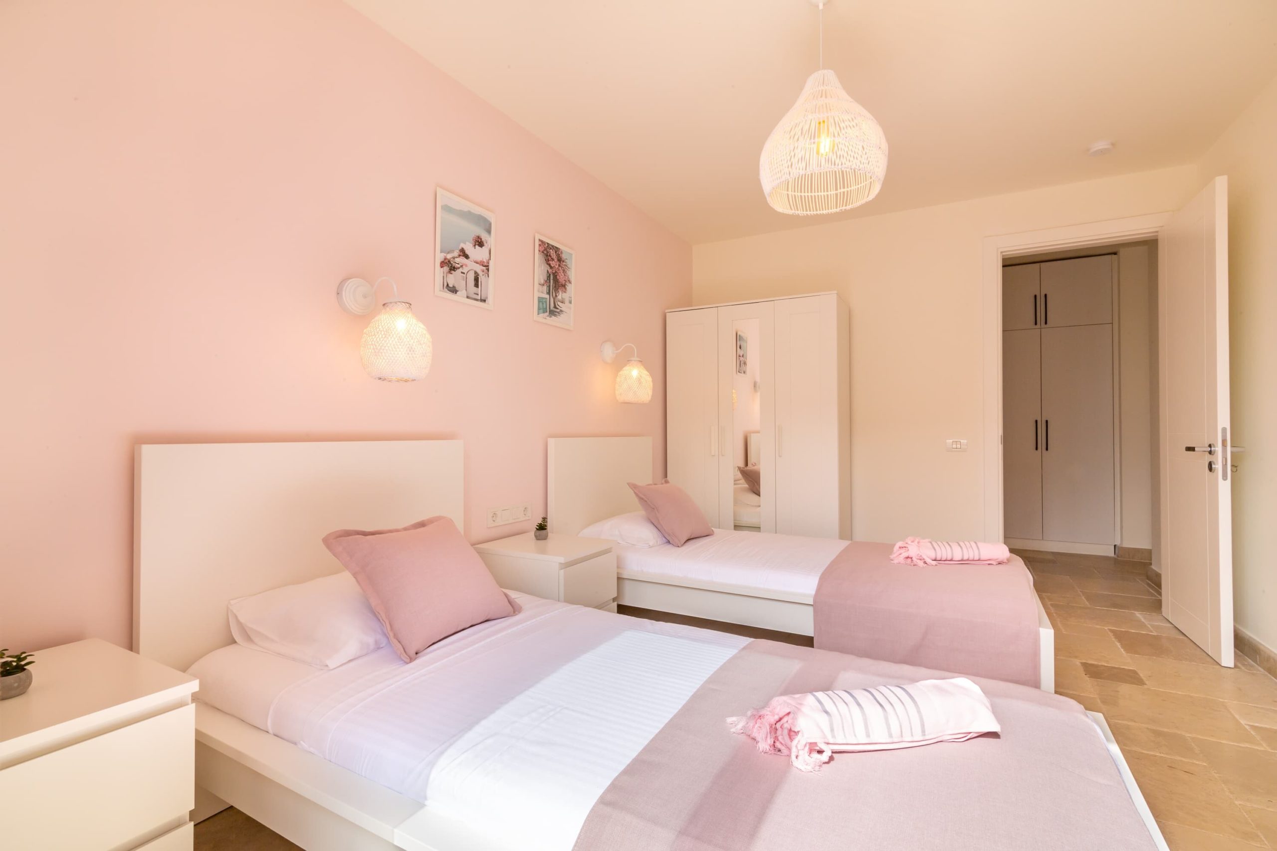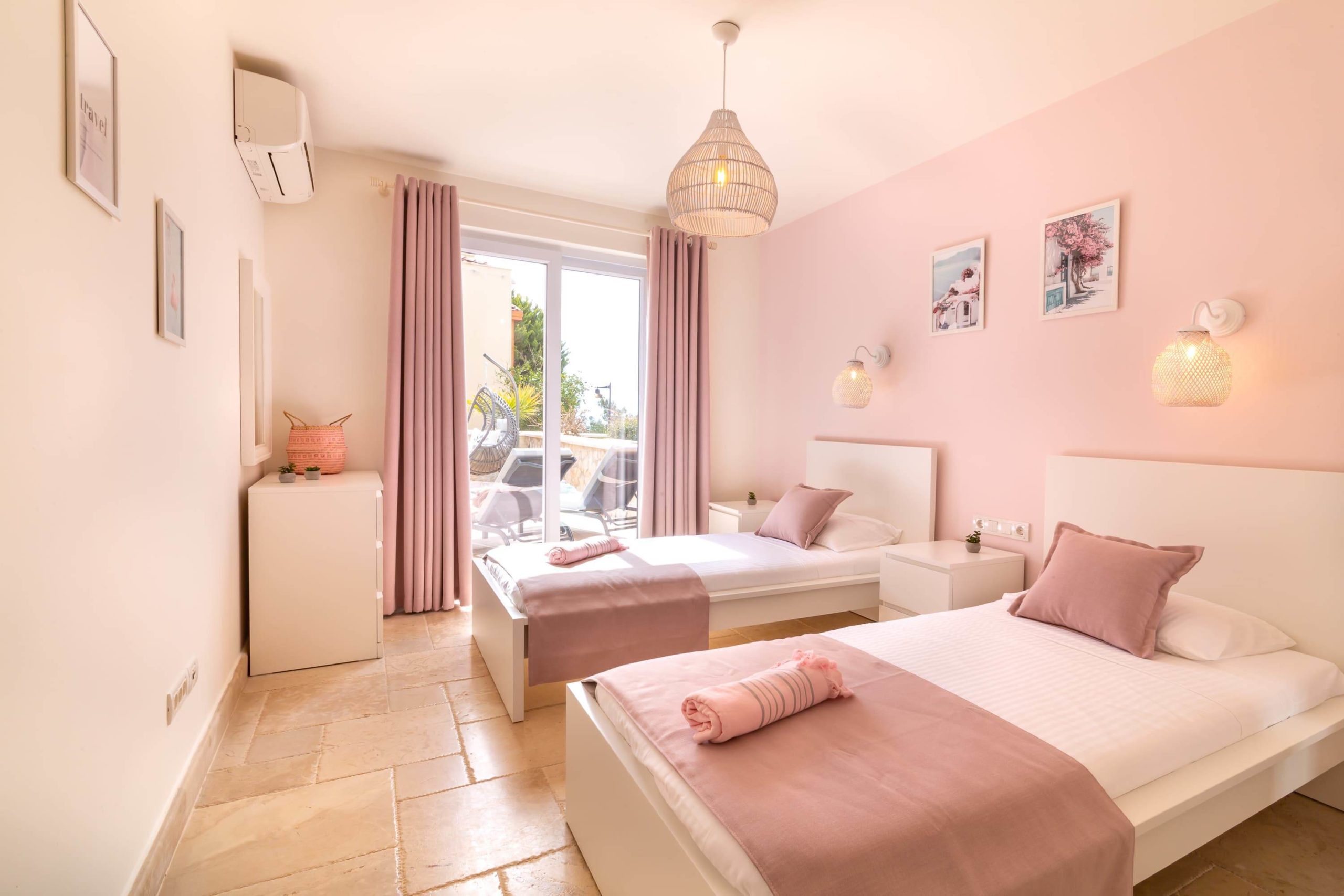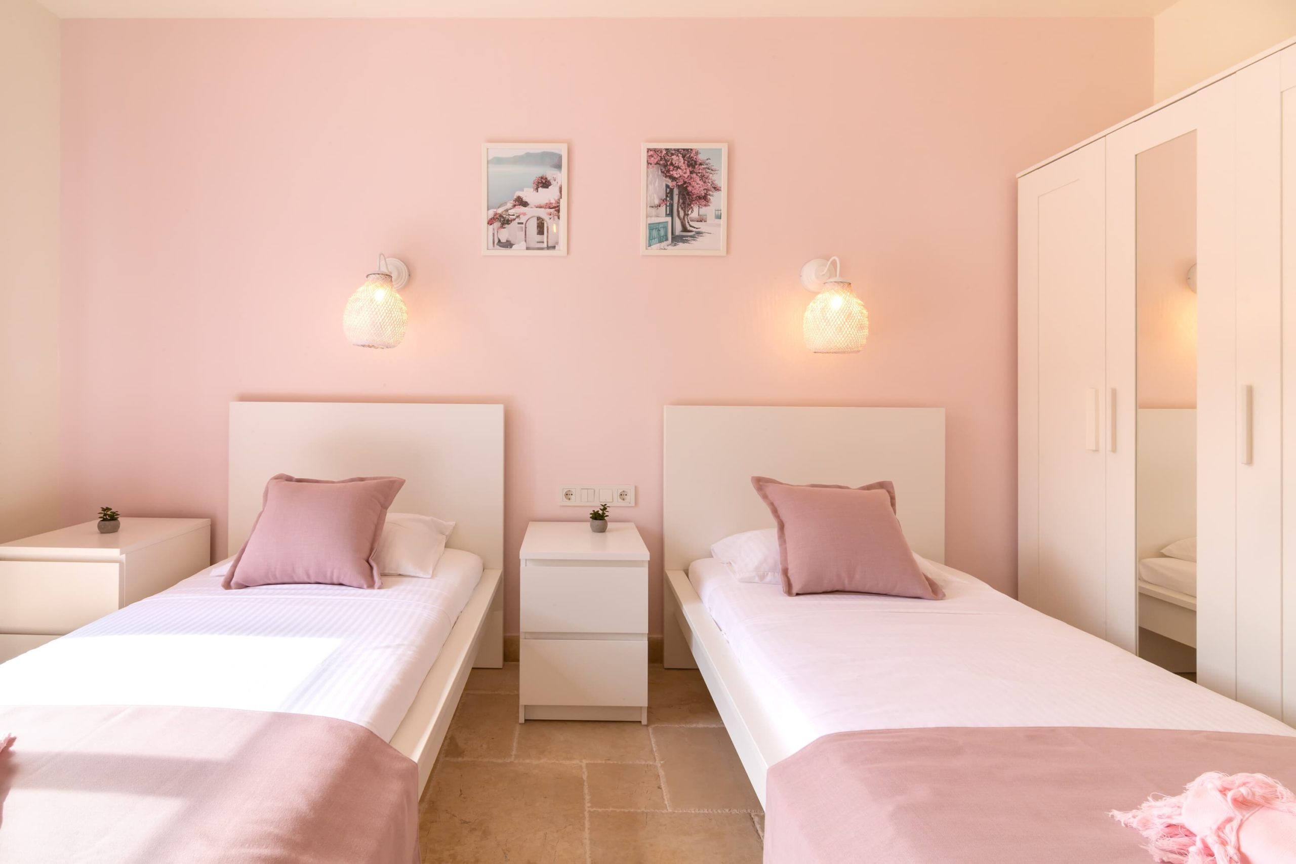 Bedroom 3:Â Twin beds with sliding doors opening onto the pool terrace.