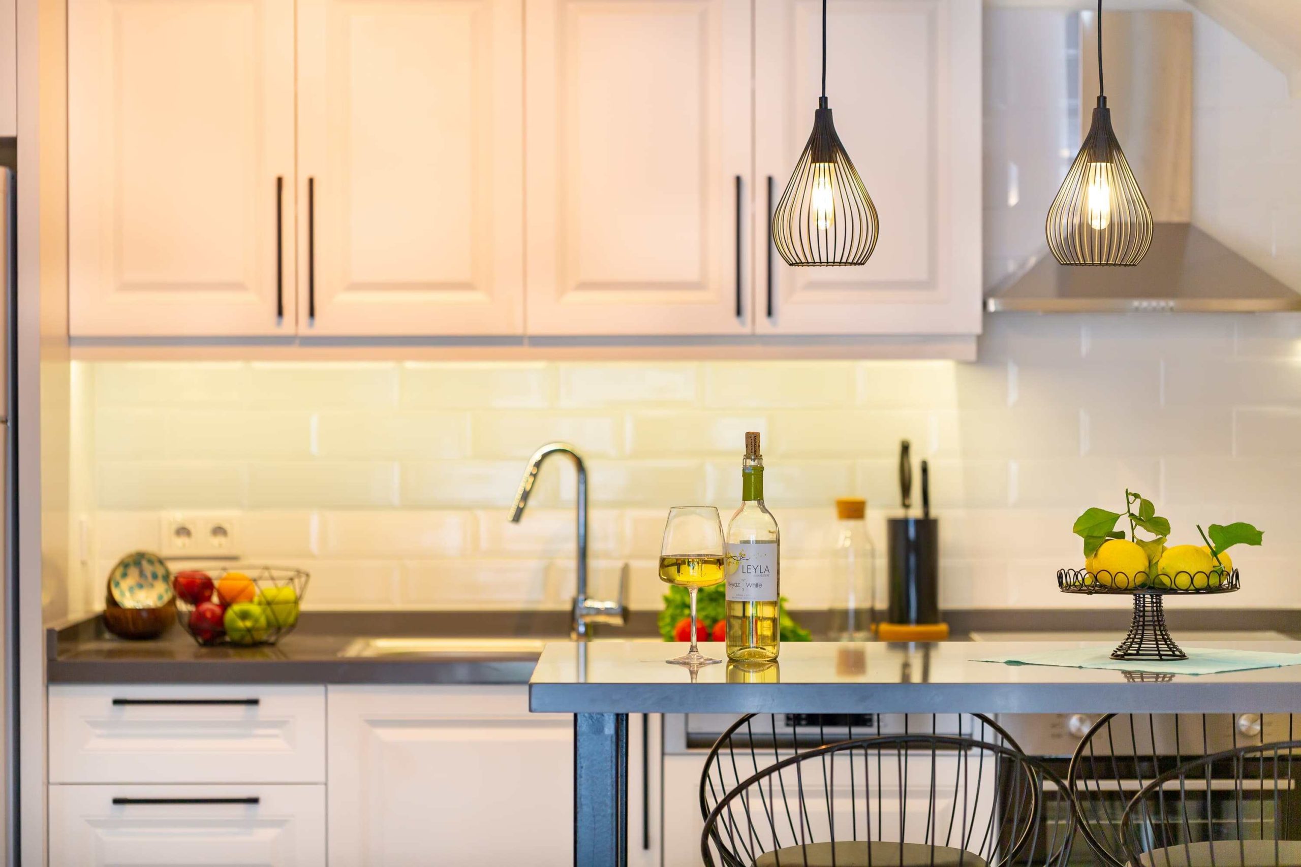 The kitchen is at the end of the open plan area and is fully equipped with modern appliances.