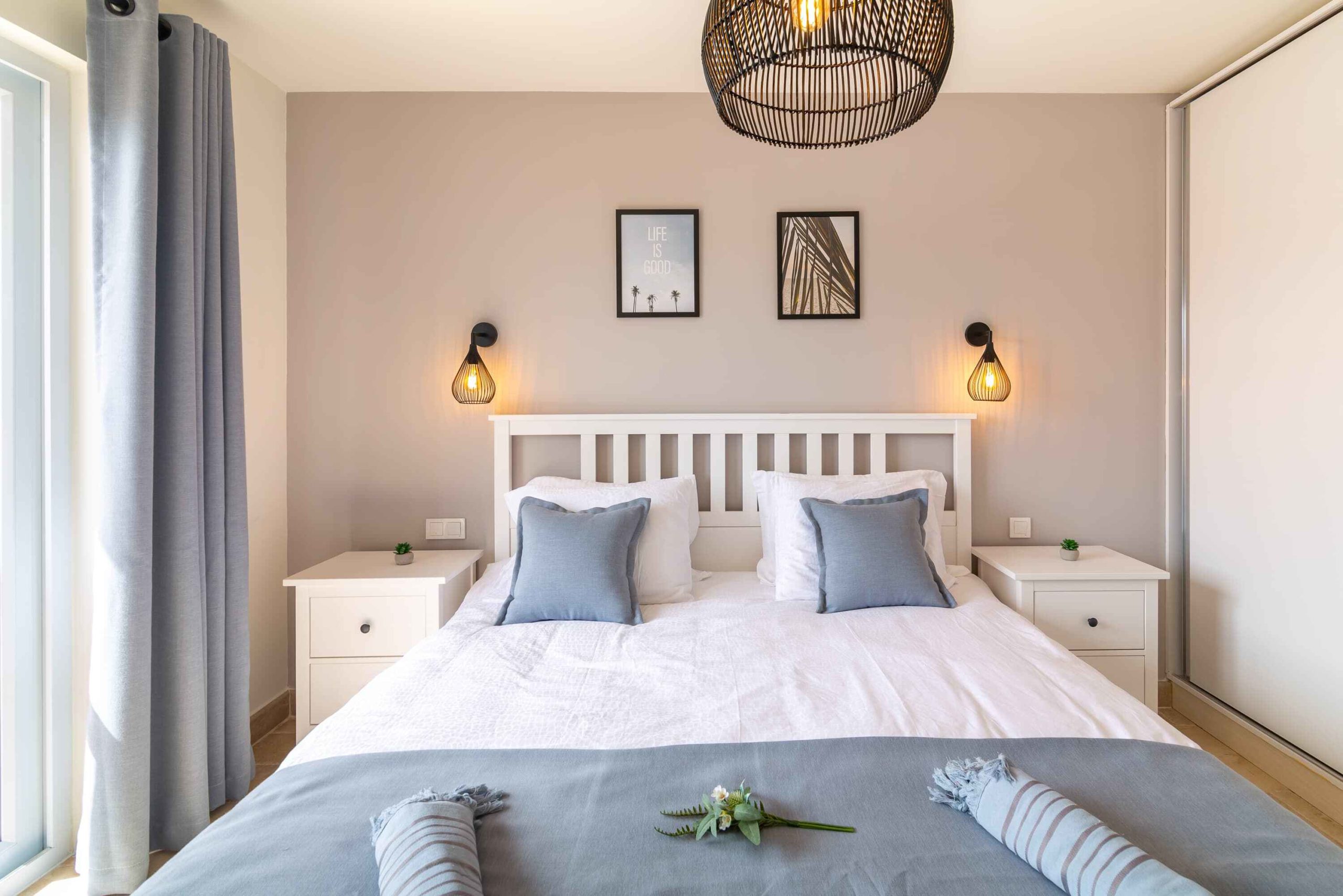 Bedroom 1:Â King size bed, bedside tables, large chest of drawers and sliding doors opening onto a juliet balcony.